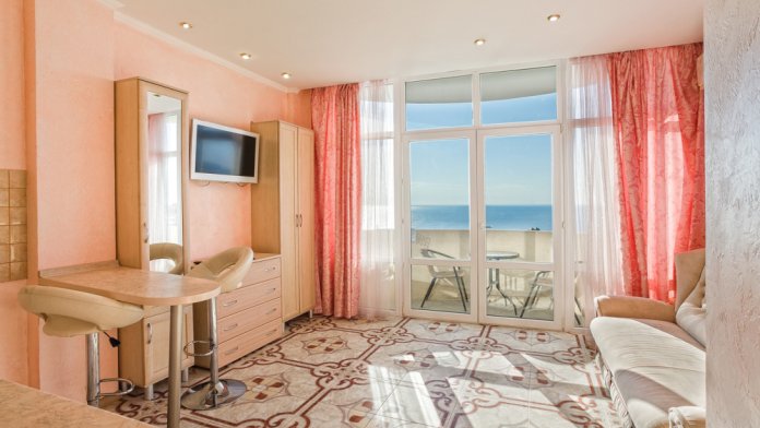 Уютная квартира на двоих, на третьем этаже шестиэтажного дома. С балкона открывается шикарный вид на море.