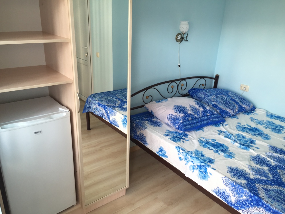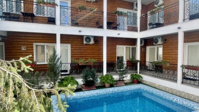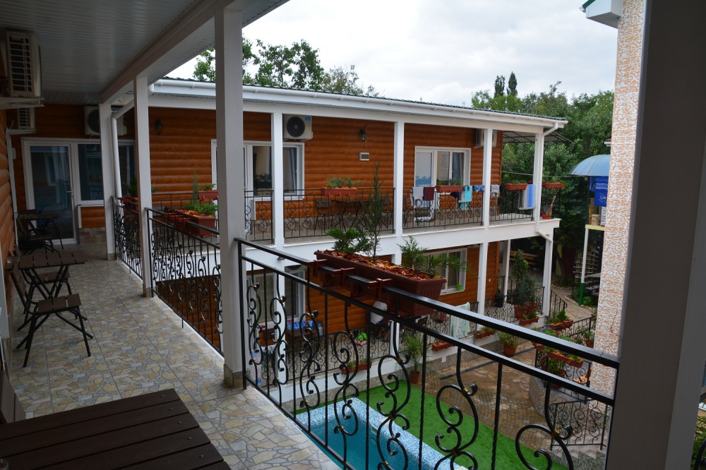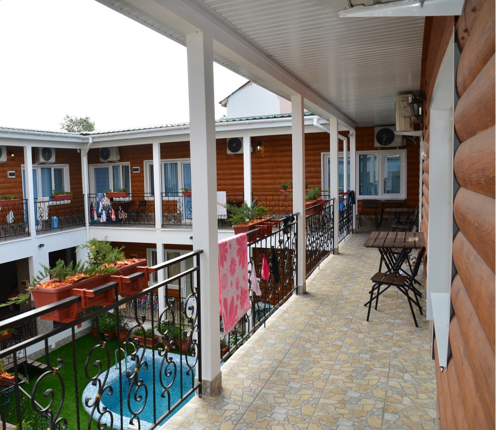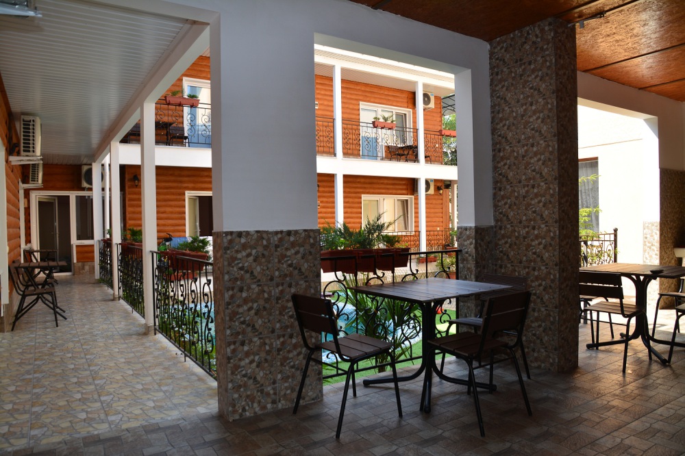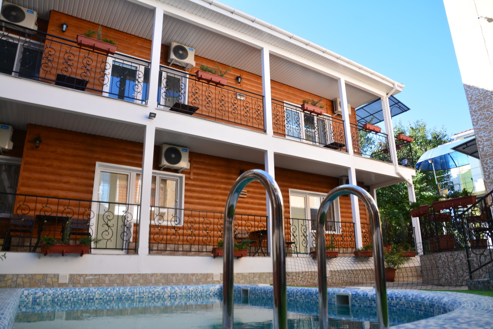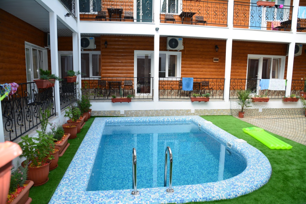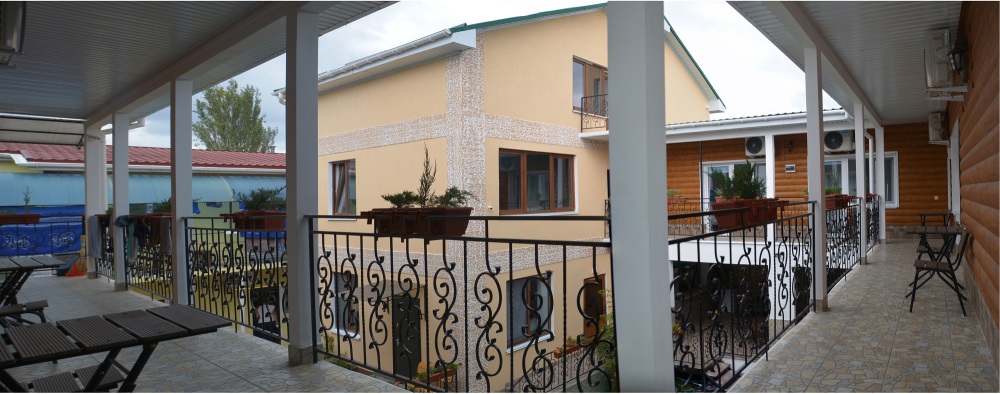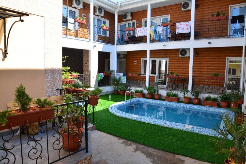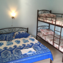 Территория дома закрытая, на территории есть: бассейн, общая кухня, мангал, сауна, зона отдыха со столиками и детский уголок. Поселиться в доме можно в 2,3 и 4-местных комнатах. В каждой комнате есть душ, туалет, кондиционер, холодильник и телевизор.