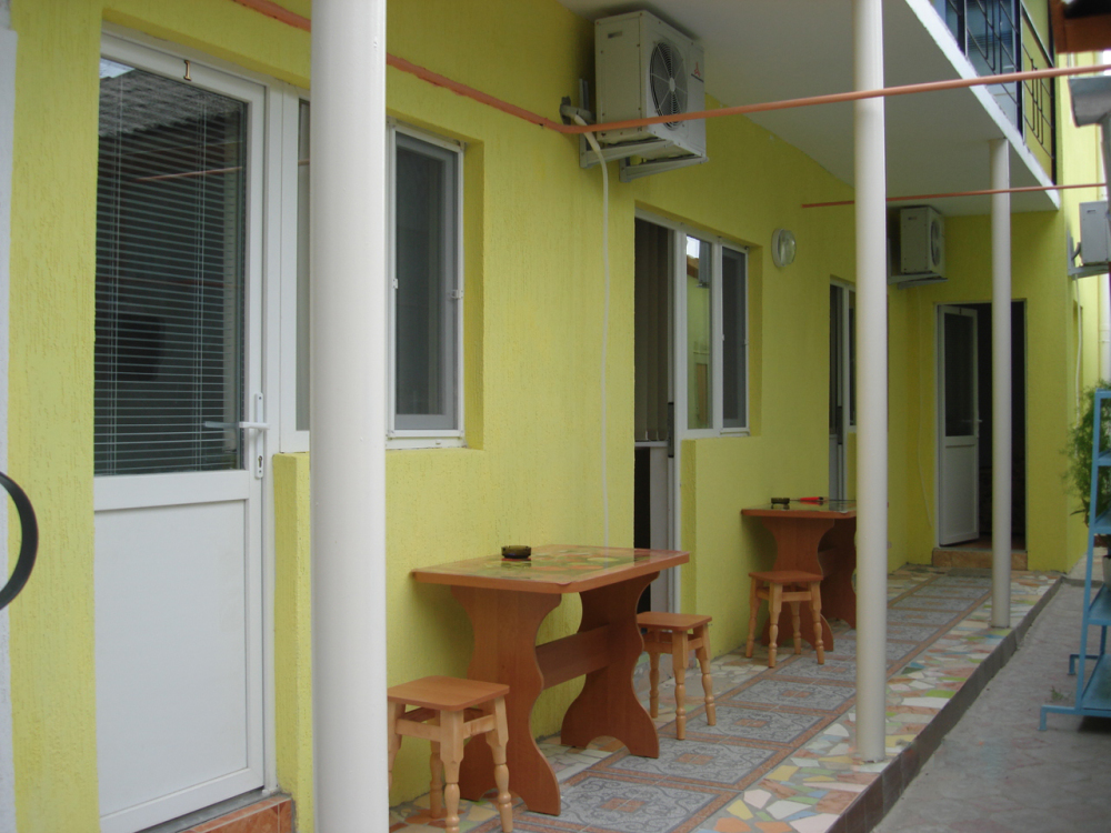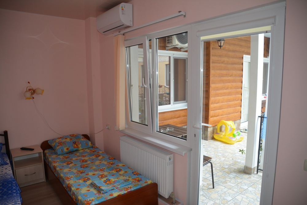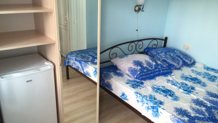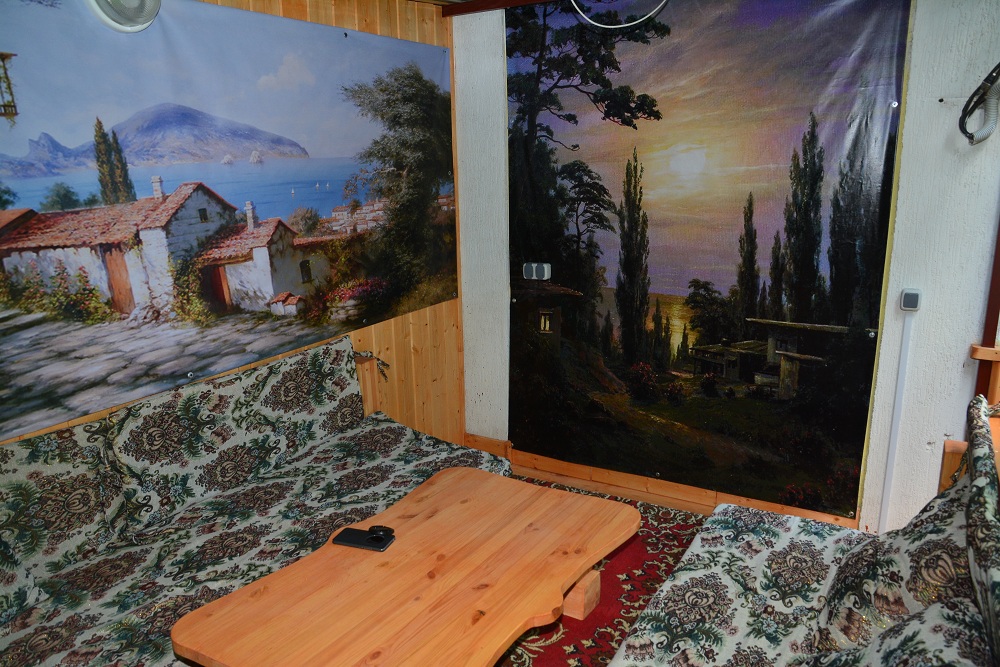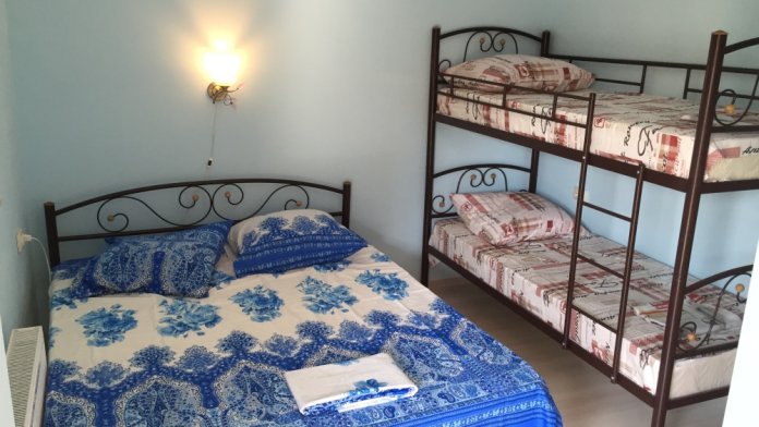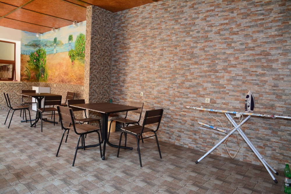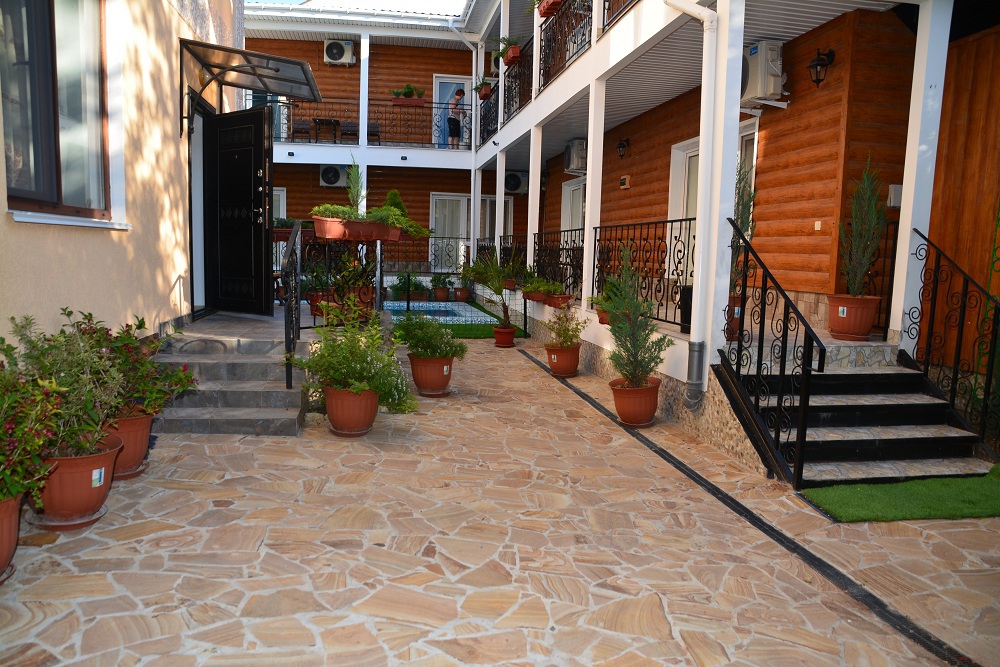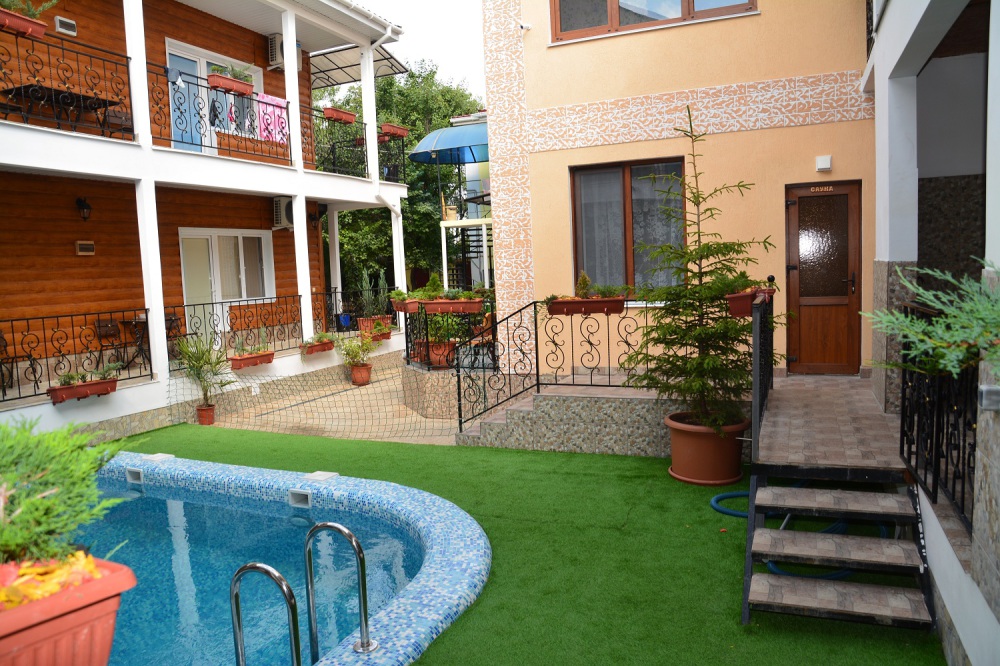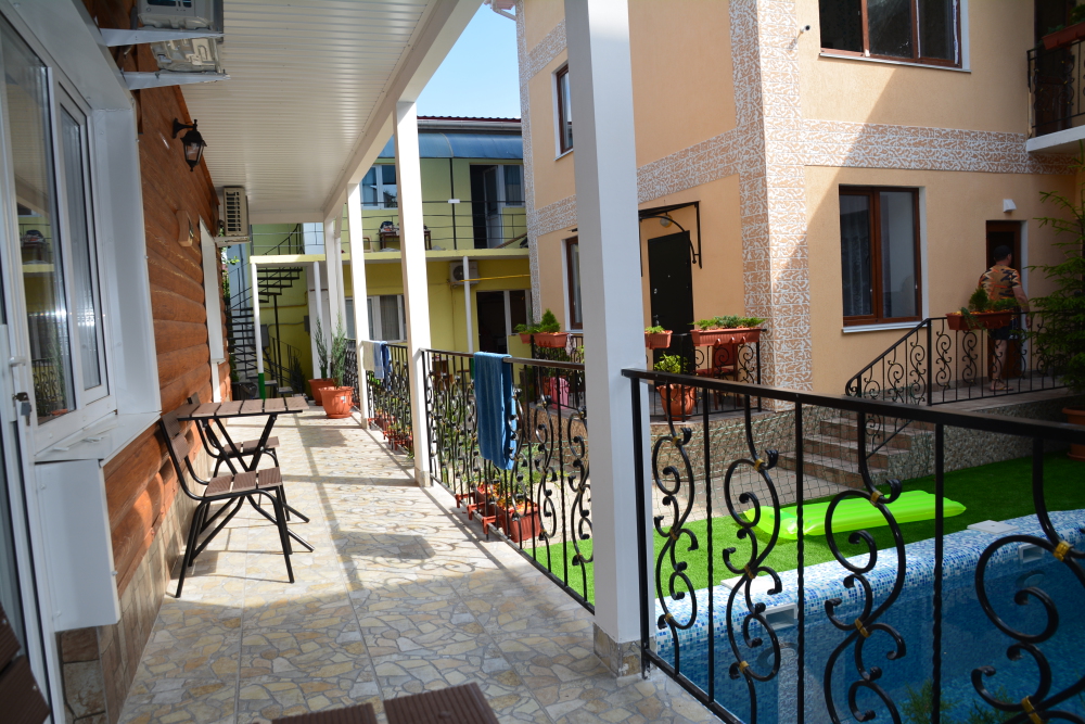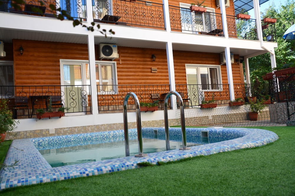 Территория дома закрытая, на территории есть: бассейн, общая кухня, мангал, сауна, зона отдыха со столиками и детский уголок. Поселиться в доме можно в 2,3 и 4-местных комнатах. В каждой комнате есть душ, туалет, кондиционер, холодильник и телевизор.