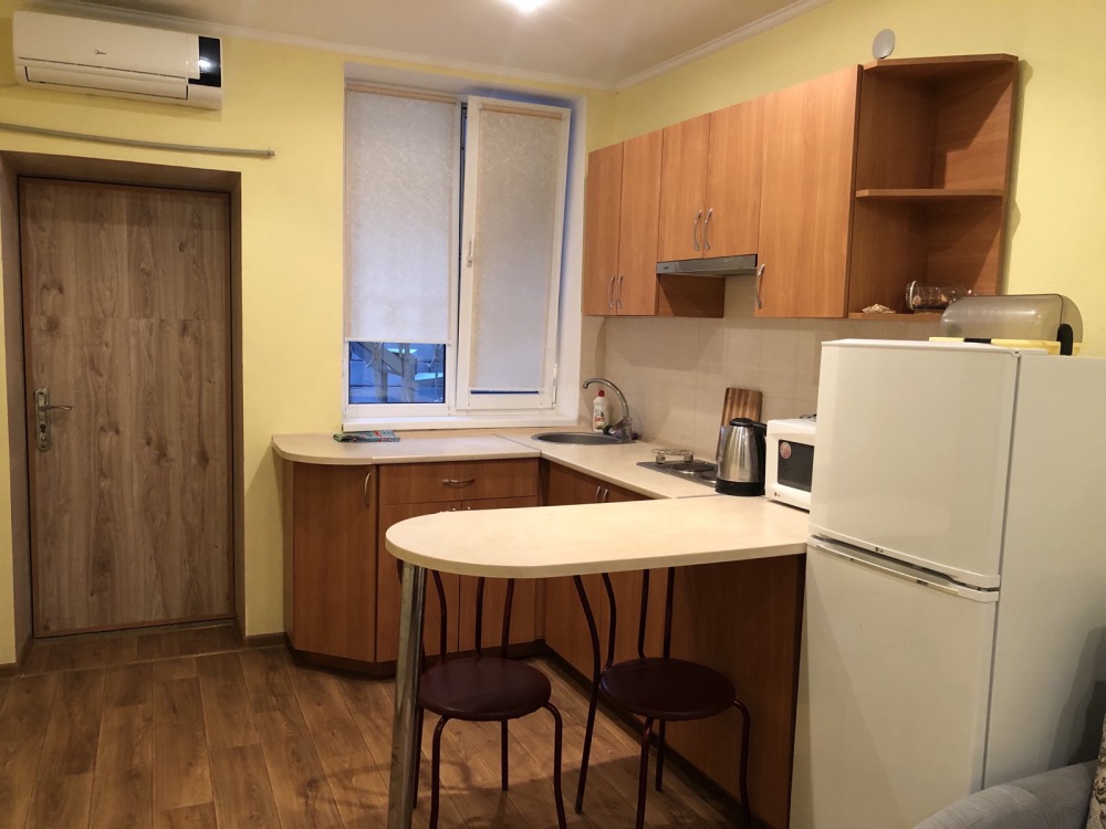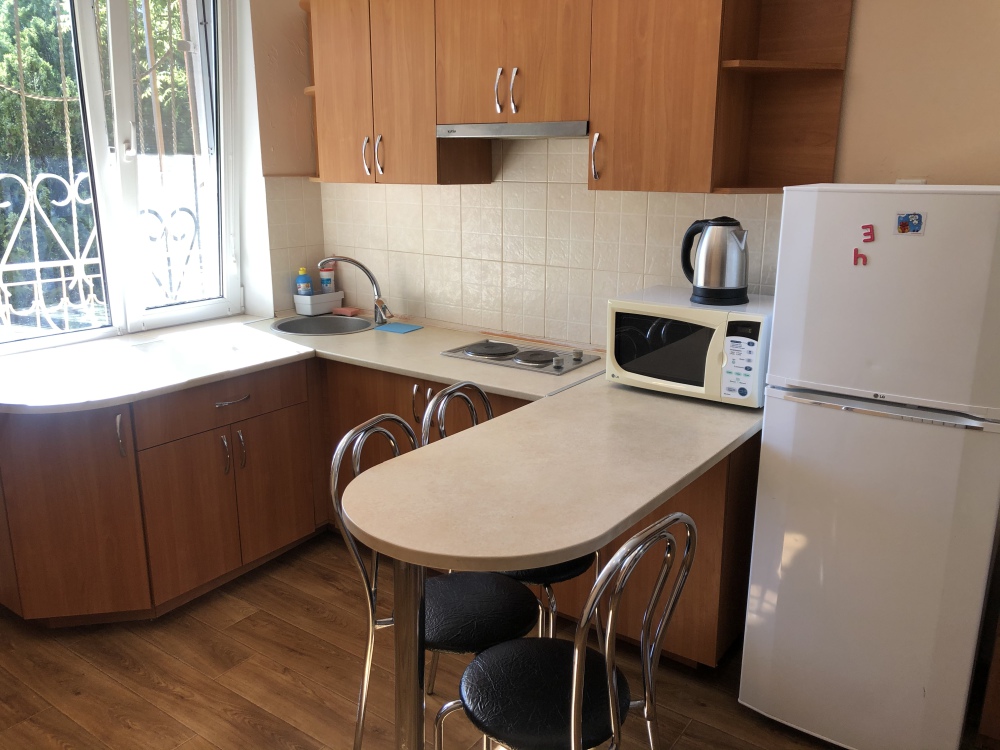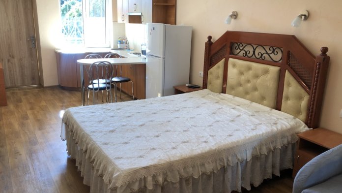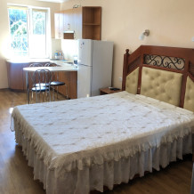 Категорически не советую. Студия с кухней расположена на первом этаже здания, стоящего посреди двора, окруженного чужими ( не хозяйскими )частными домами, т.е. ни какого дворика с мангальной зоной нет- мангал стоит в метрах 30, возле чужего частного дома. Чтобы попасть во двор ( место между частными домами) и оставить там машину ( заявлено как парковка) необходимо проехать и пройти мимо пьяной толпы соседей, которые навязываются знакомится. Вечером вообще будет страшно выйти. Когда заселились оплатила по глупости сразу всю сумму за две ночи. Осмотревшись на месте, (пробыли 5 мин, даже вещи не занесли), попросила вернуть деньги т.к. решили съехать, хозяин отказался возвращать. Еле вернул за сутки, еще и нахамил сказал какая цена, такой и сервис!!!