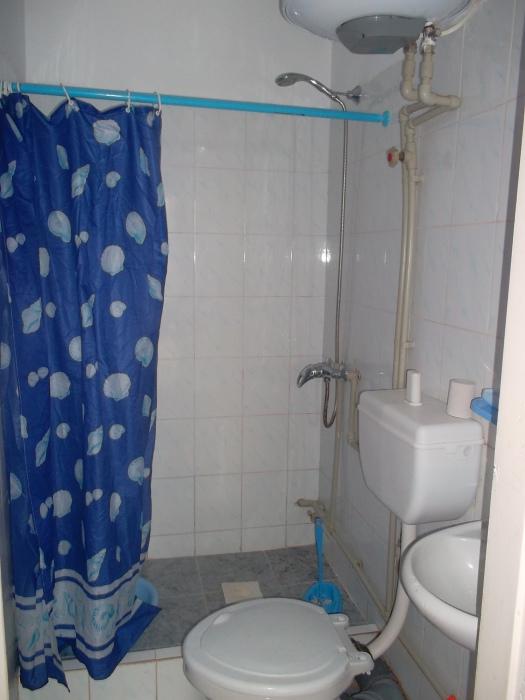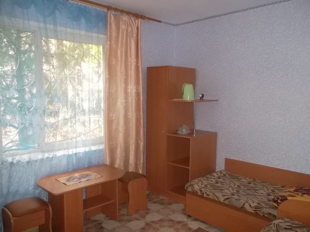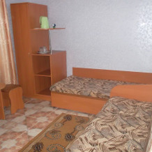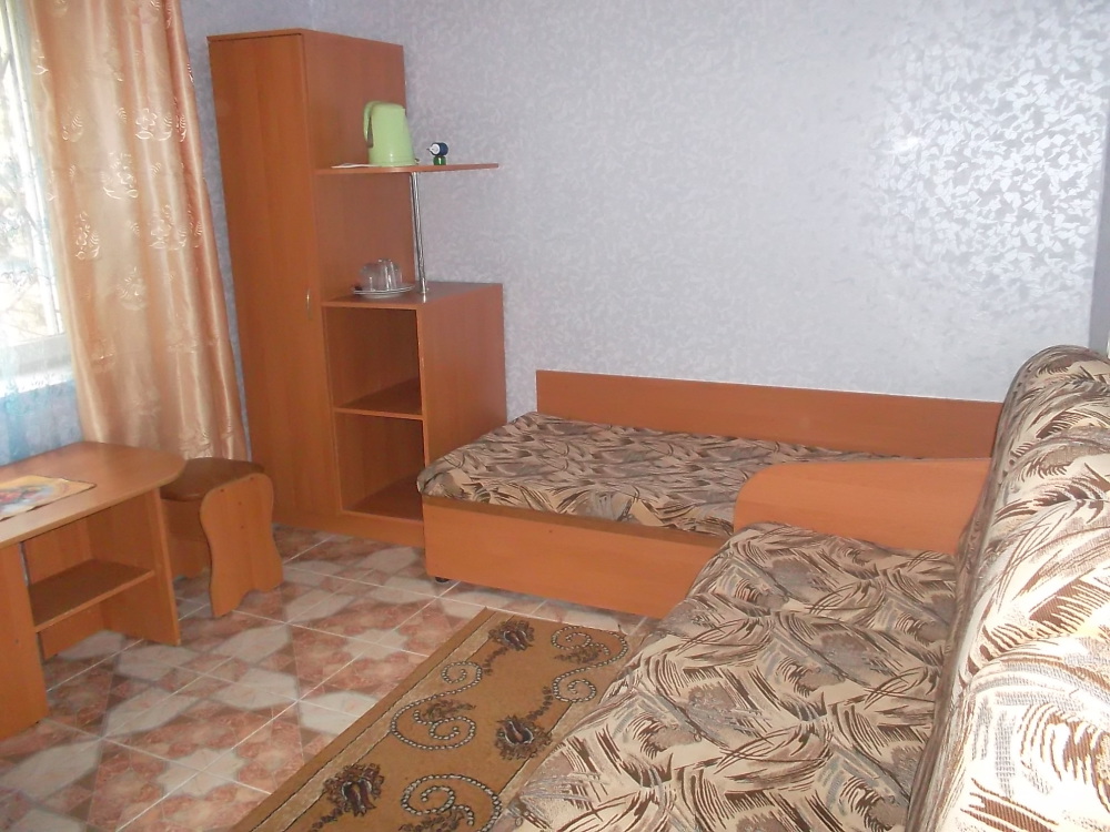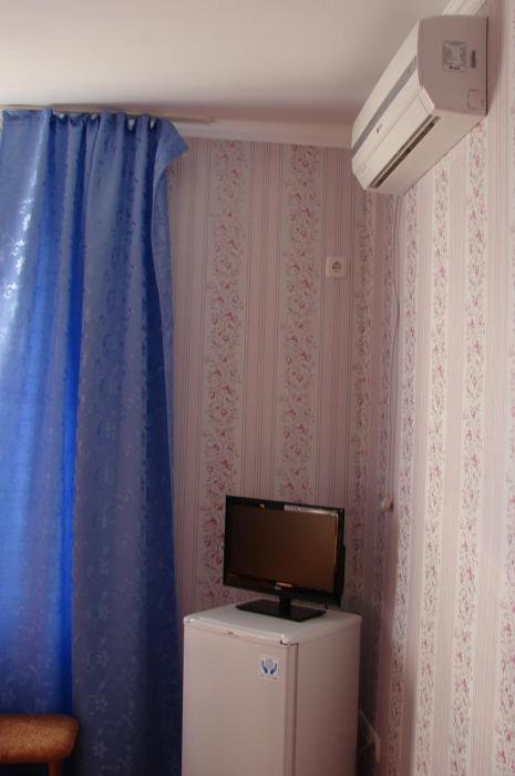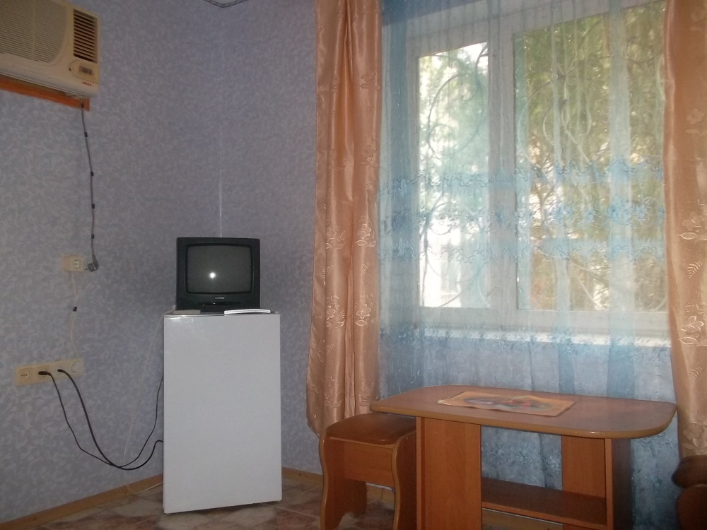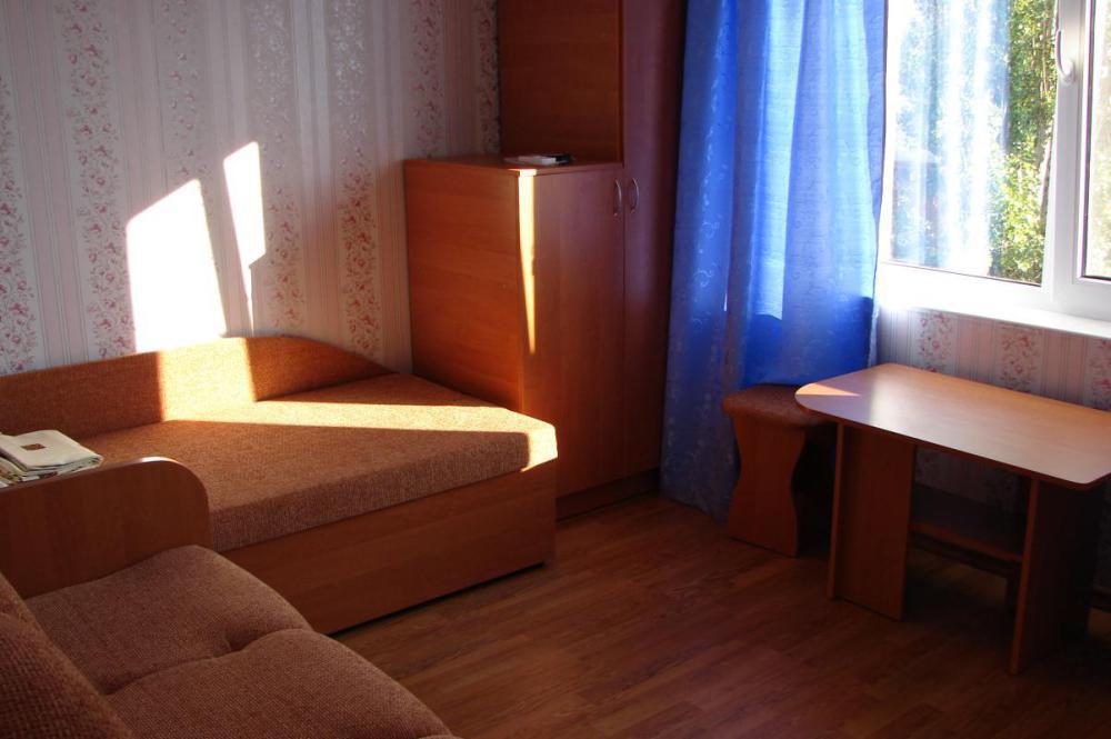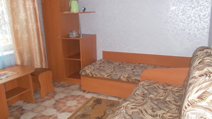 Раскладной диван, полуторная кровать, шкаф, журнальный столик, стулья — мебель новая. В каждом номере кондиционер, холодильник, электрочайник.