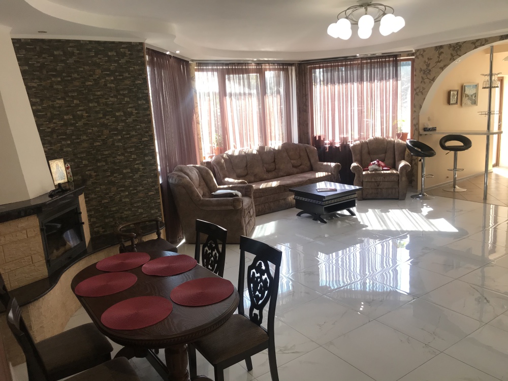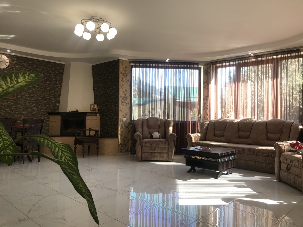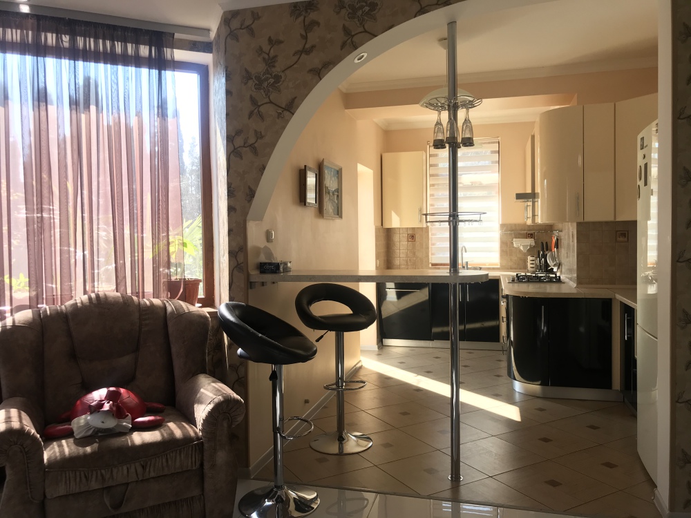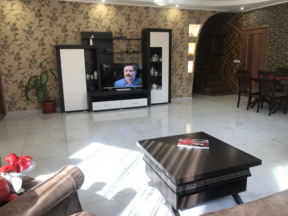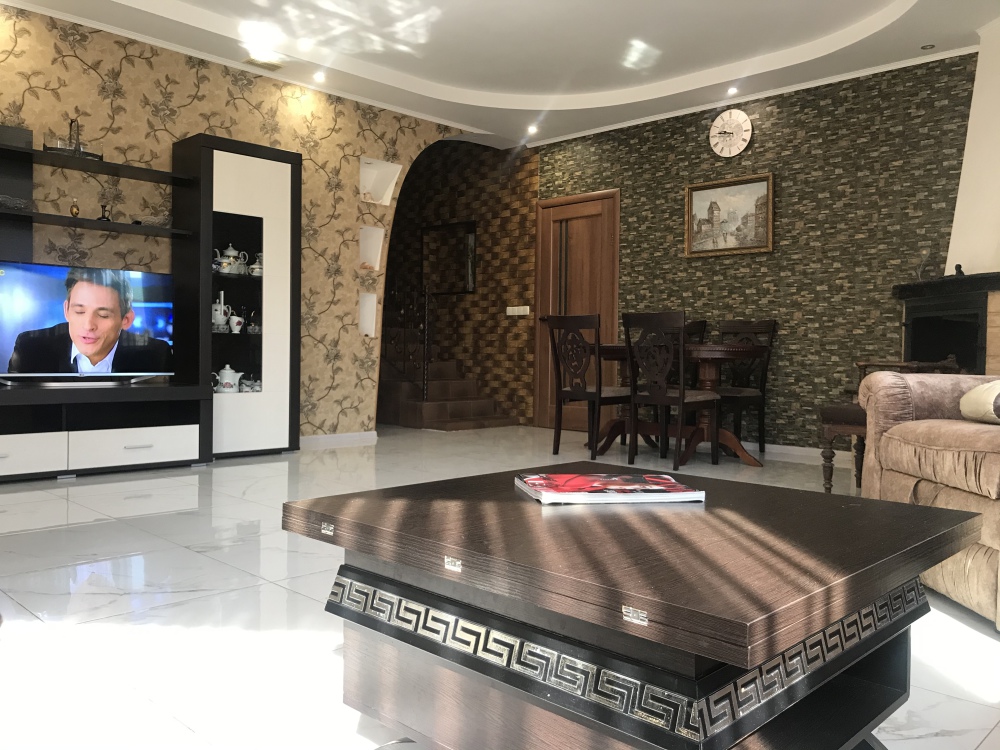 На первом этаже расположена гостиная-кухня с разделяющей их барной стойкой. Выход с кухни во двор, большой коридор, санузел, smart-3D телевизор, камин, посудомоечная машина.