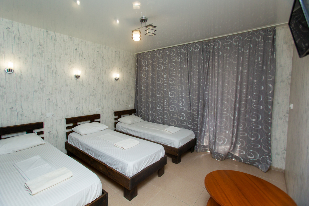 Уютный трехместный номер со всеми удобствами. В номере находятся кровати с ортопедическим матрасами и качественным постельным бельем, телевизор, холодильник, кондиционер, чайник, фен. В душевой комнате есть новая сантехника и туалетные принадлежности. Бесплатный WI-Fi.