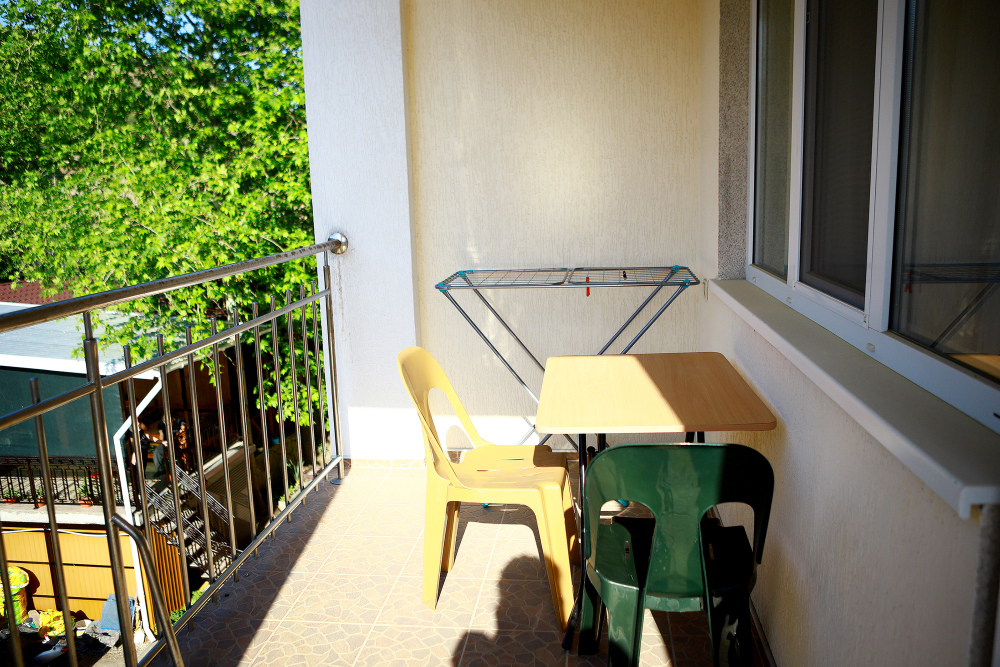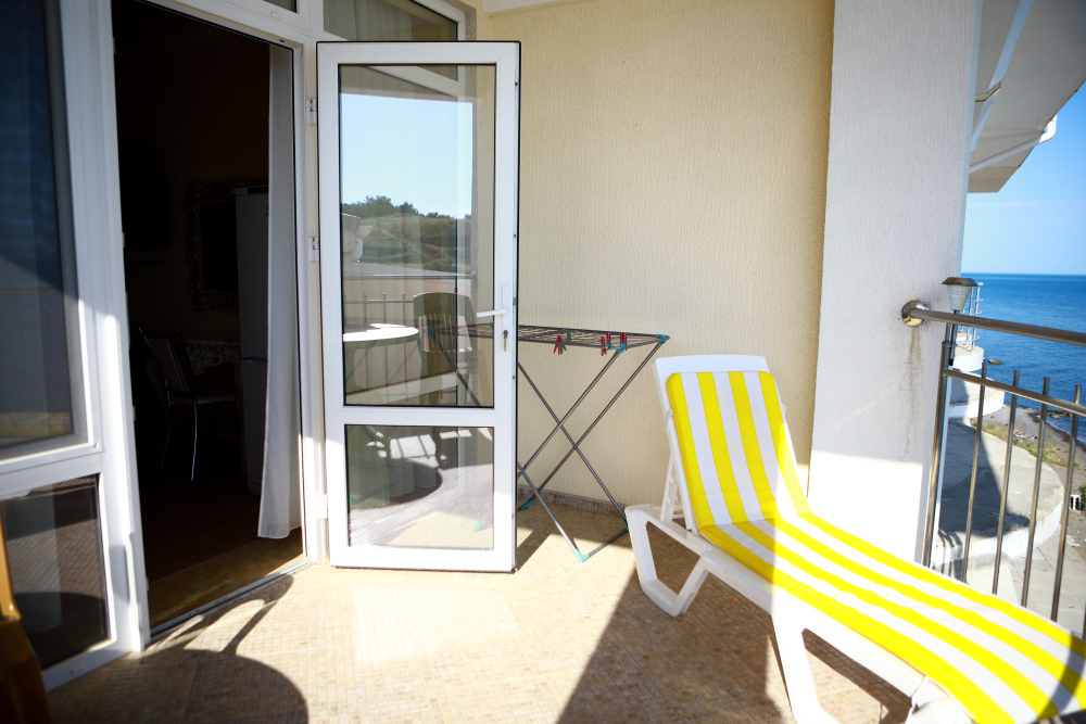 Большой балкон со столом и стульями, а также шезлонгом с видом на море. Ванная комната с душем, туалетные принадлежности горячая и холодная вода круглосуточно.