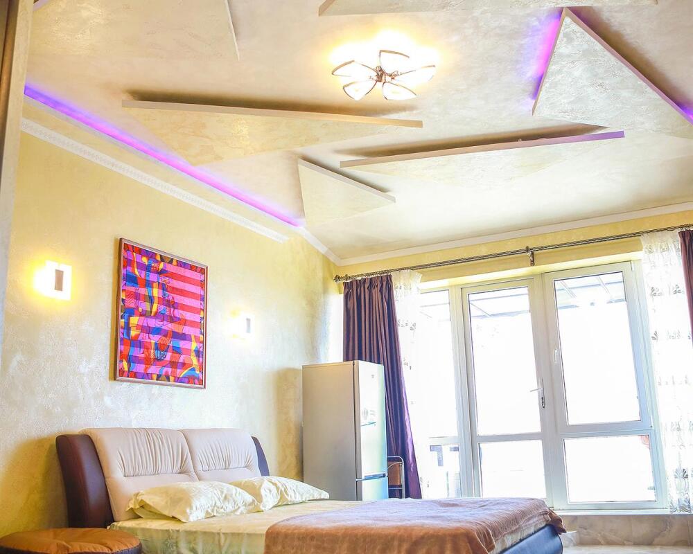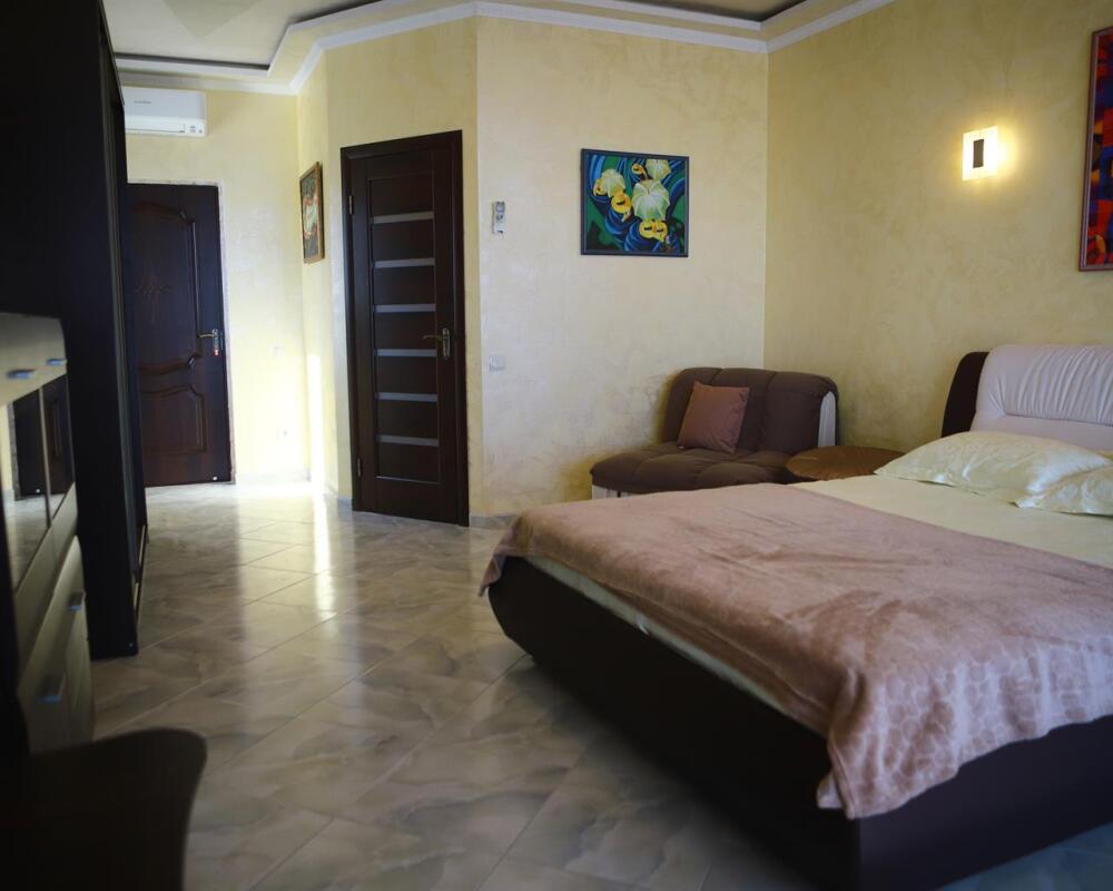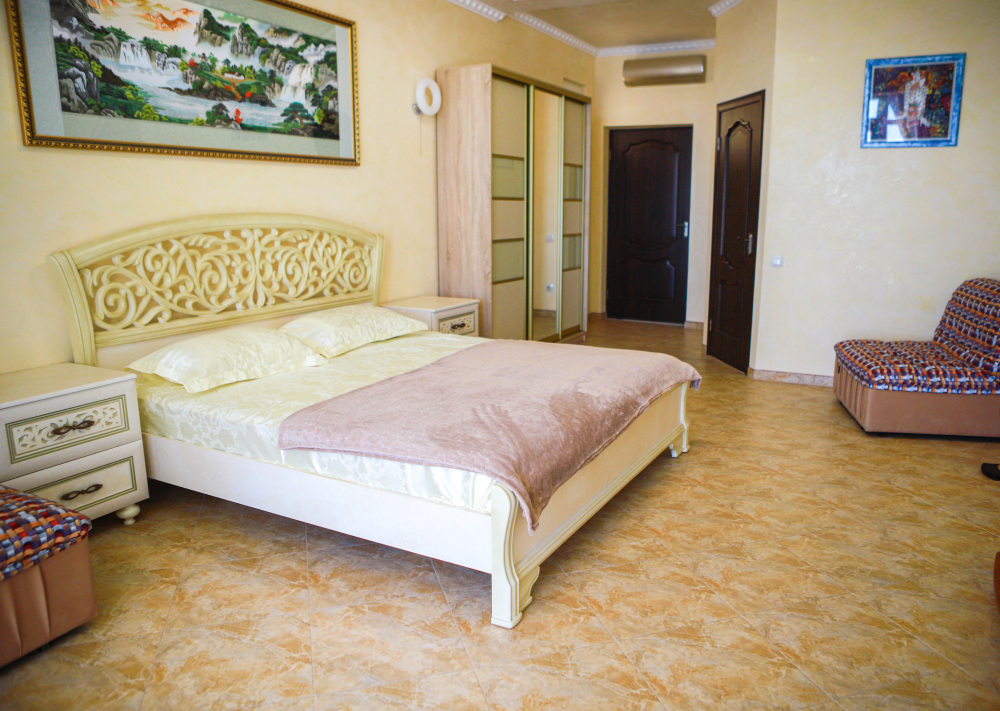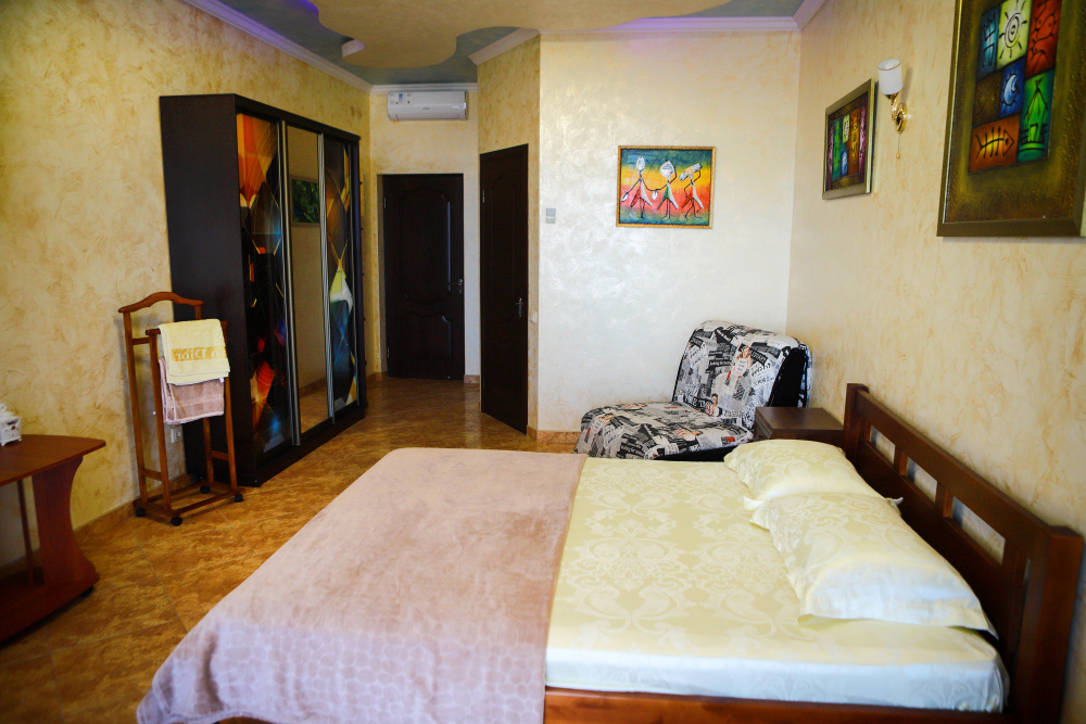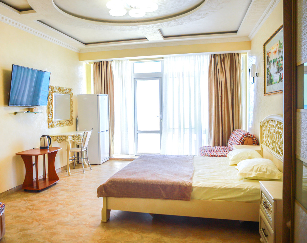 В номере кондиционер, большая двуспальная кровать, две раскладные кресло-кровати, большой холодильник, чайник, столовые приборы, шкаф для одежды, плазменный телевизор. Большой балкон со столом и стульями, а также шезлонгом с видом на море.