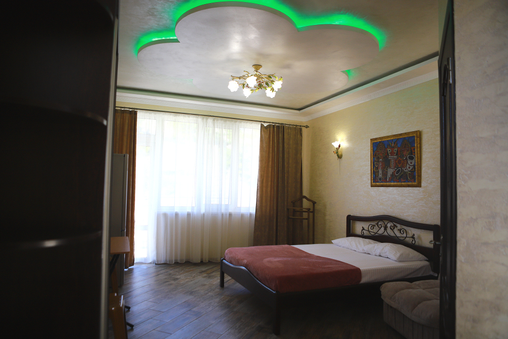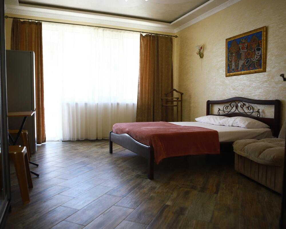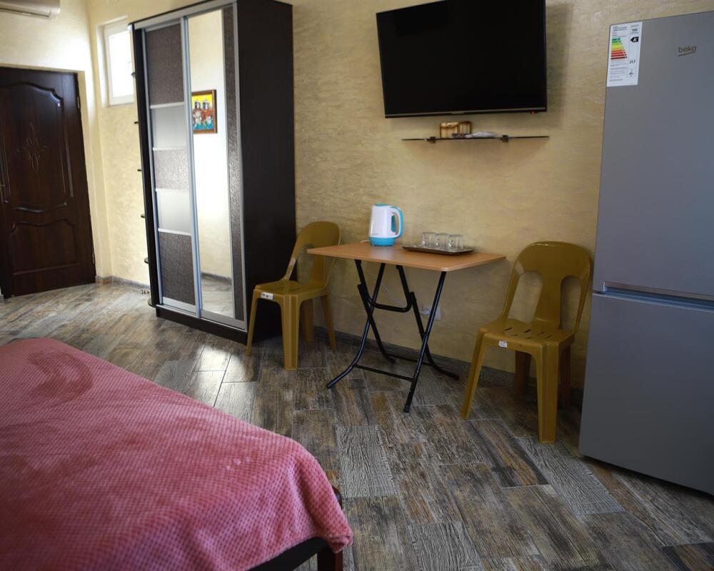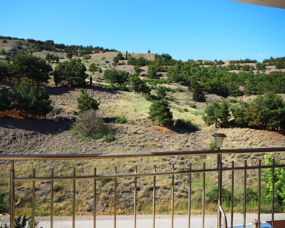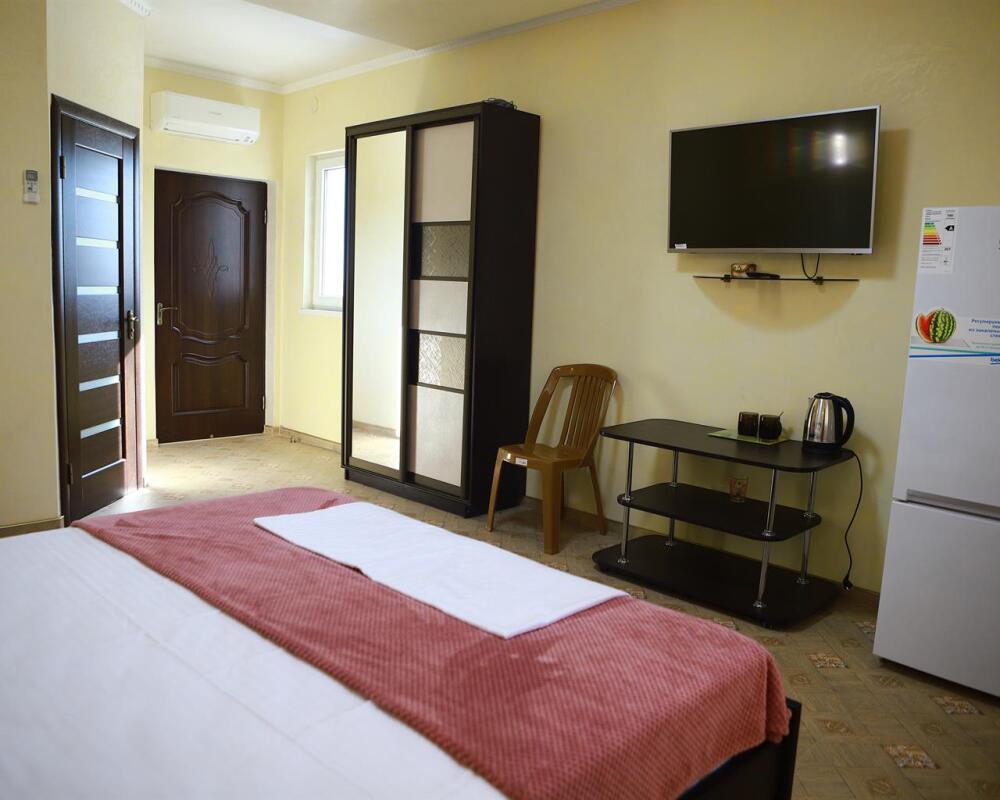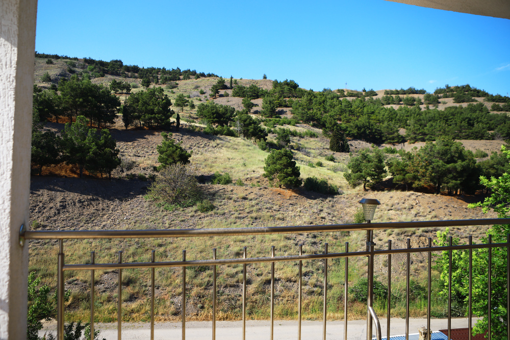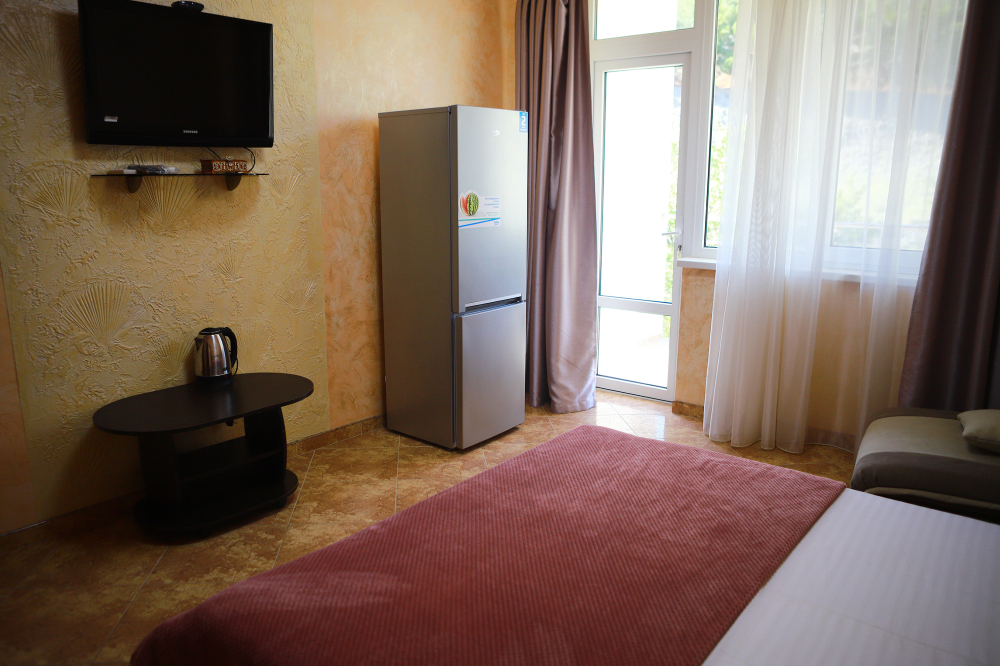 Номер с открытым балконом. В номере двуспальная кровать, раскладное-кресло кровать, телевизор, чайник, холодильник, кондиционер, столовые приборы, шкаф для одежды, Ванная комната с душем, горячая и холодная вода круглосуточно. Вид на горы.
