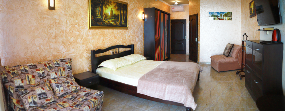 В номере кондиционер, большая двуспальная кровать, две раскладные кресло-кровати, большой холодильник, чайник, столовые приборы, шкаф для одежды, плазменный телевизор.