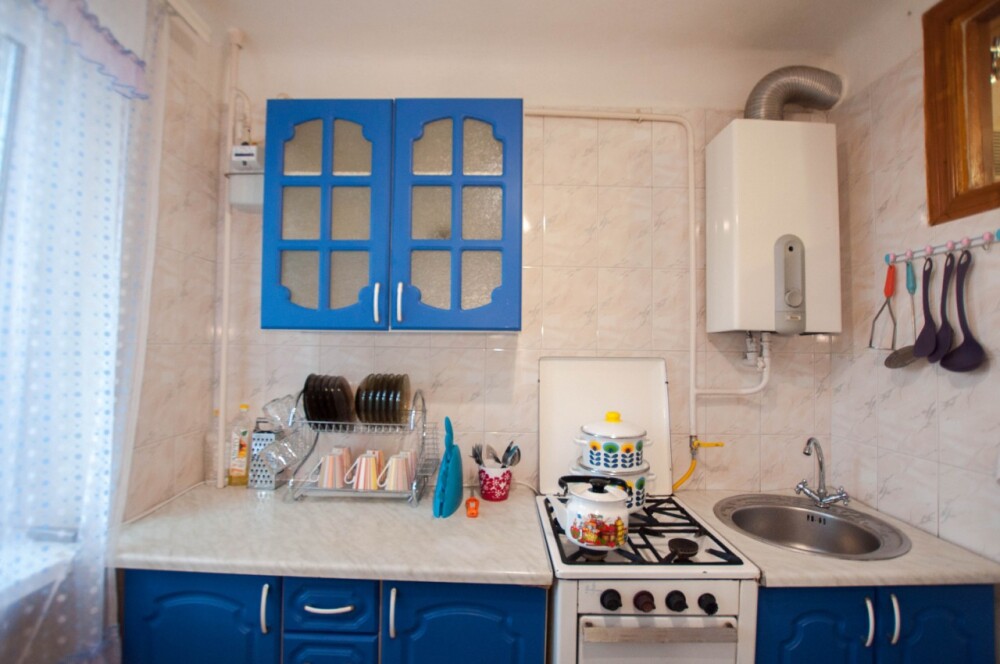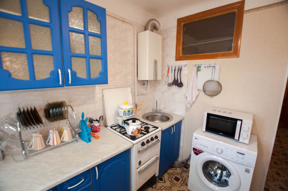 — бытовая техника: кондиционер, плоский телевизор, кабельное телевидение, Wi-Fi, холодильник, стиральная машина, микроволновая печь, газовая плита, газовая колонка, а также утюг с гладильной доской и фен,