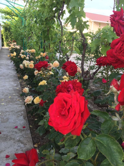 В Вашем распоряжении будет большая территория, на которой расположены площадка для размещения автомобилей, летняя кухня, беседки, детская площадка, мангальная. На территории много цветов, винограда, фонтанчик.