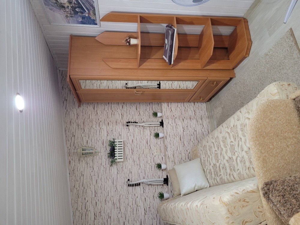 В домике: раскладной,односпальный диван шириной 0.90см,диван-книжка 2х спальный шириной 1м20,шкаф,трюмо,тумбочка,вентилятор на пульте,кондиционер,тв,вайфай.Санузел личный в домике.Кухня личная внутри домика,полностью укомплектована: газовая плита,холодильник,необходимая посуда,кухонная мебель.Рядом с домиком,в тени можжевеловых деревьев,стоит личный стол под зонтиком,кресла,качели,где можно кушать и отдыхать на свежем воздухе.