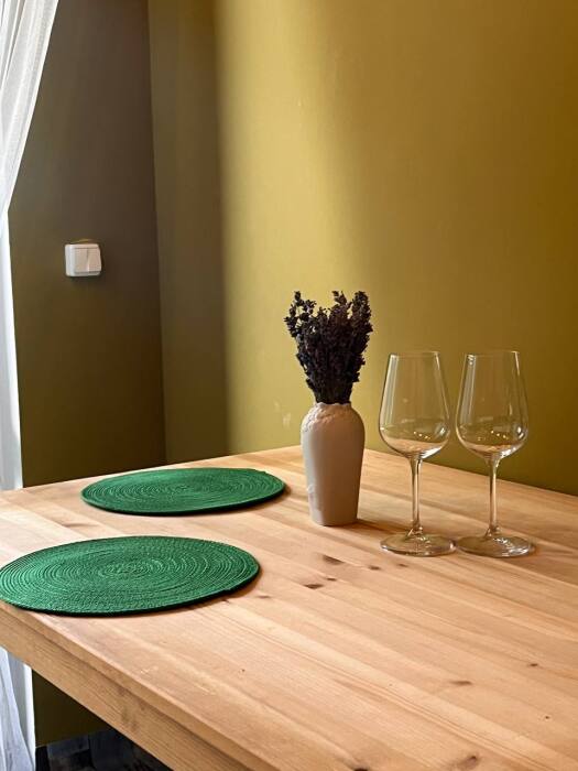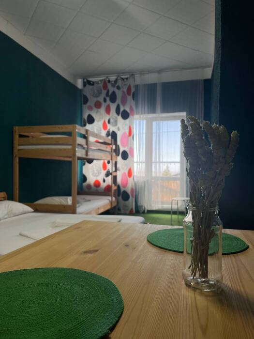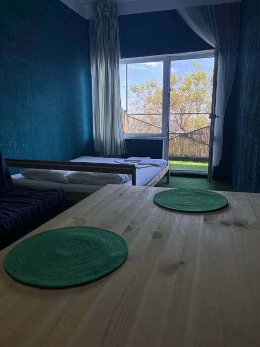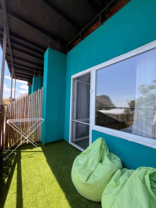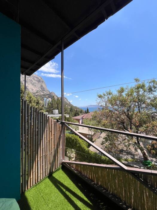 Номер с выходом на собственный балкон, откуда Вы сможете насладиться видом на море и горы. На балконе удобные пуфики, а покрытие имитирует мягкую траву, что позволяет расслабиться еще больше. В апартаментах двуспальная и двухъярусная кровать с белоснежным бельем, на кухне посуда, необходимая для приготовления, а индукционная плита позволит ускорить процесс. В санузле постоянный доступ к горячей воде, полотенца и фен. Охладиться после жаркого солнца поможет кондиционер, а ночью Вы сможете открыть балкон, наслаждаясь свежим воздухом, так как на балконной двери есть дверь-сетка.