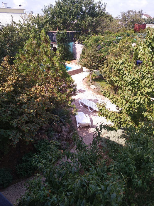 На территории среди цветов и фруктовых деревьев ухоженного сада имеется большой открытый бассейн, площадка для загорания, шезлонги, уютная беседка с барбекю.