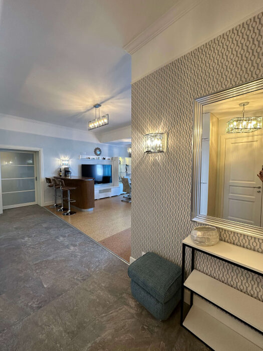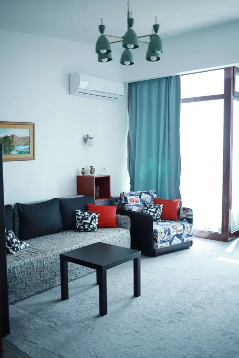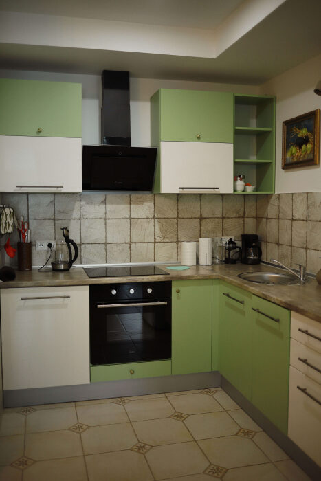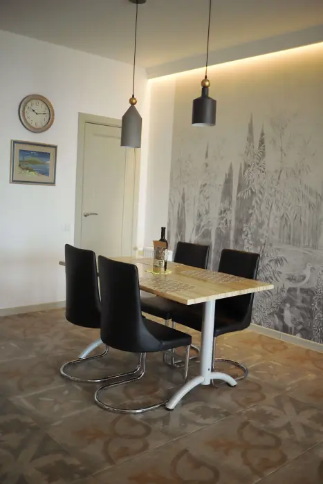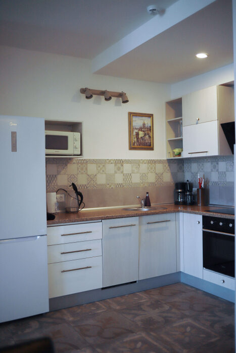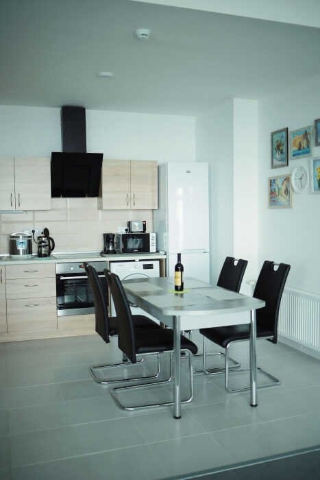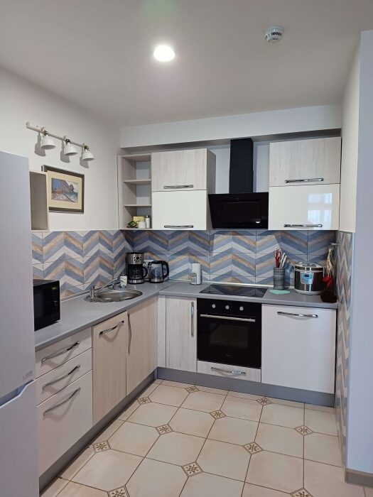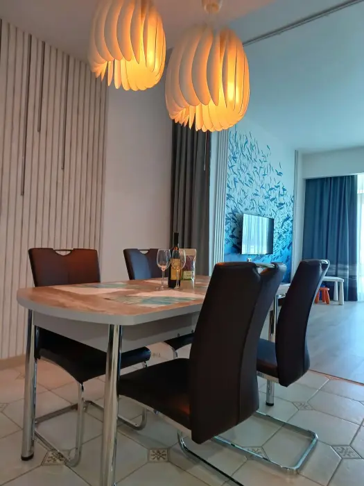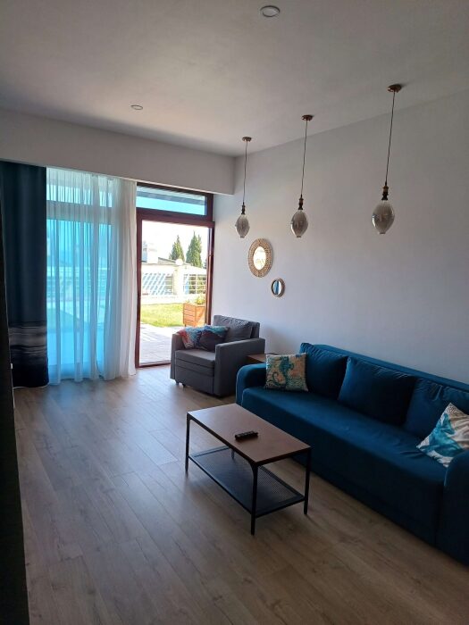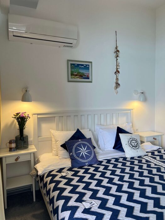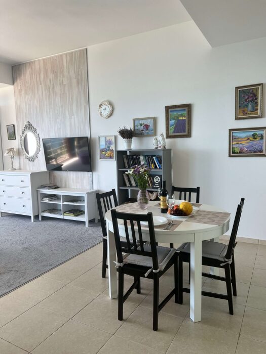 Оформлен в легком современном стиле. Очень уютный и светлый апартамент. Выходя на террасу, будто выходишь на палубу корабля, где то внизу море перешептывается с галькой, а легкий морской бриз развевает волосы. Светильник-чайки над диваном и макет корабля над огромным телевизором, только усиливают эффект ощущения морского круиза. Огромный диван, как кают-компания, а на современной и полностью оборудованной кухне, можно почувствовать себя настоящим коком.