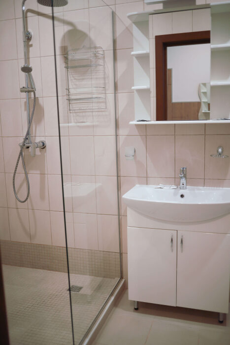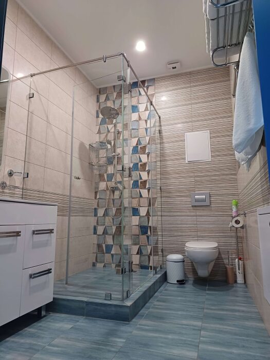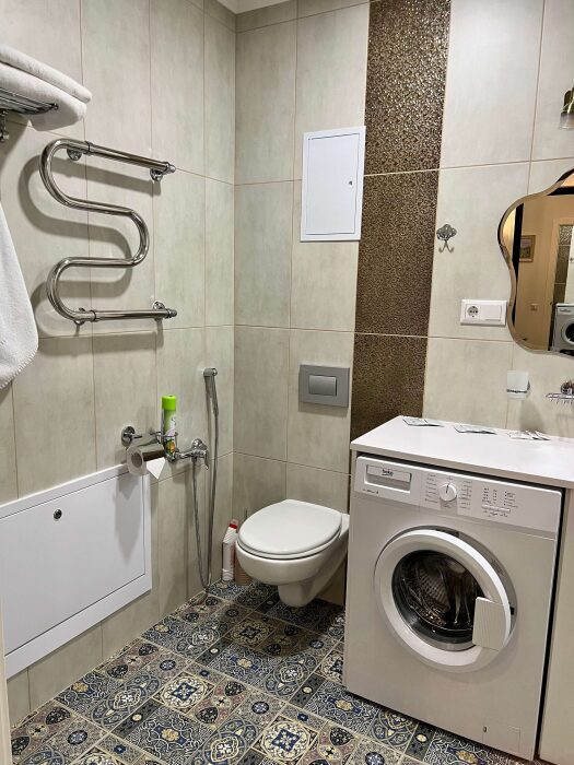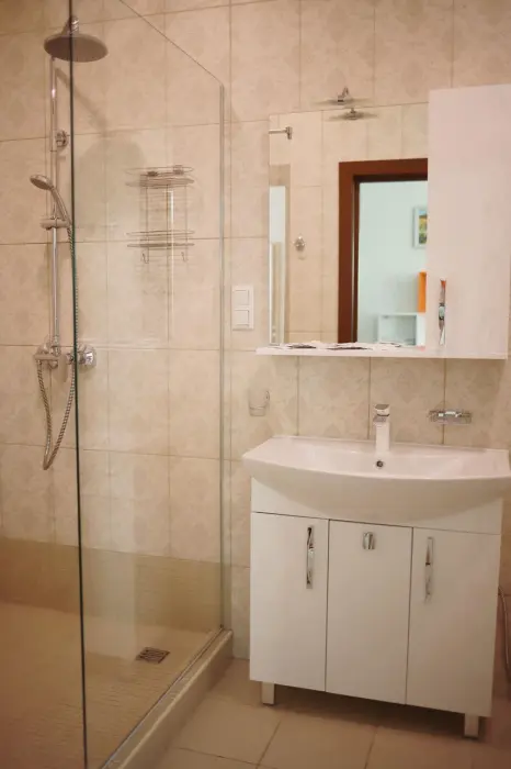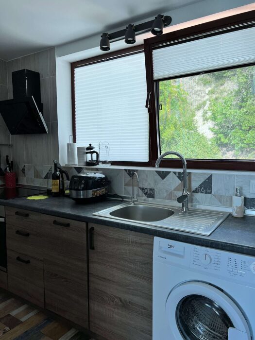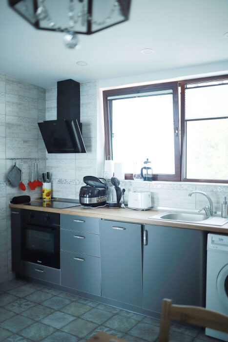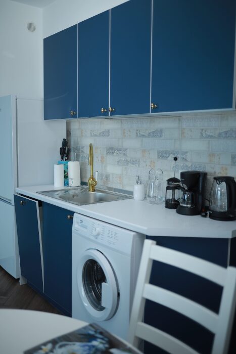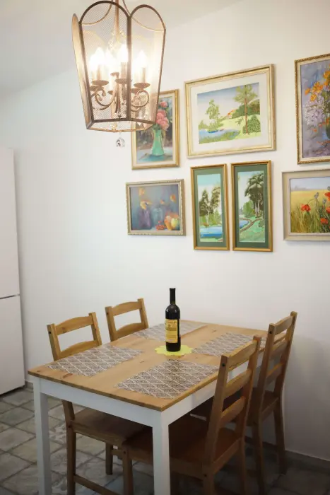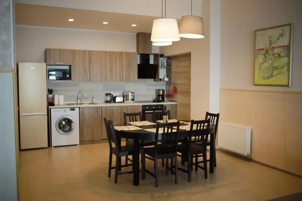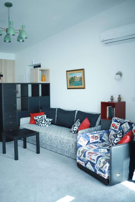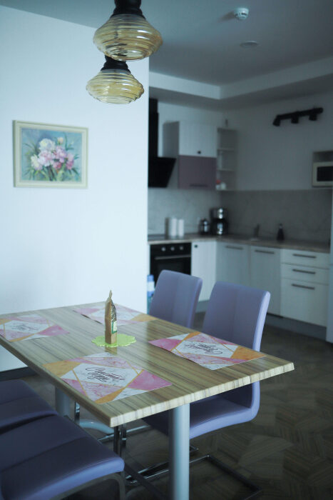 Оформлен в легком современном стиле. Очень уютный и светлый апартамент. Выходя на террасу, будто выходишь на палубу корабля, где то внизу море перешептывается с галькой, а легкий морской бриз развевает волосы. Светильник-чайки над диваном и макет корабля над огромным телевизором, только усиливают эффект ощущения морского круиза. Огромный диван, как кают-компания, а на современной и полностью оборудованной кухне, можно почувствовать себя настоящим коком.