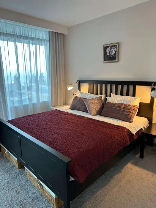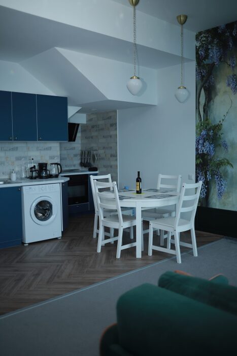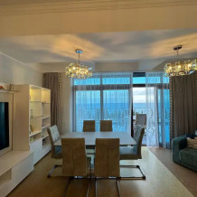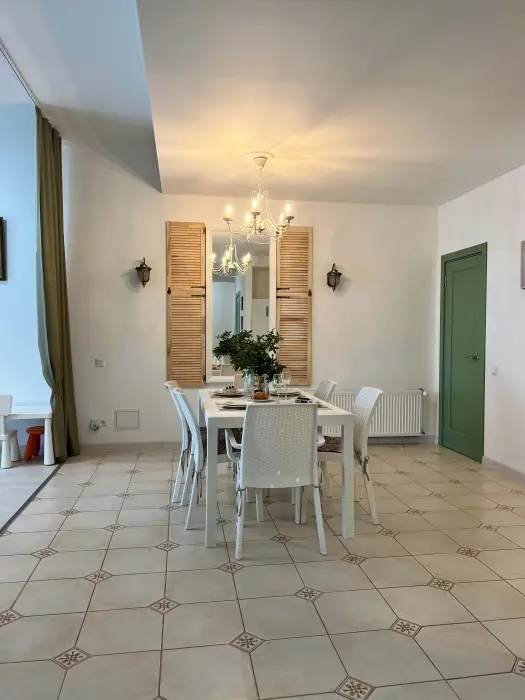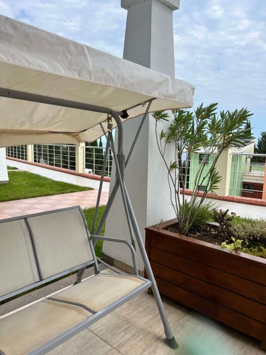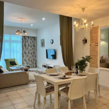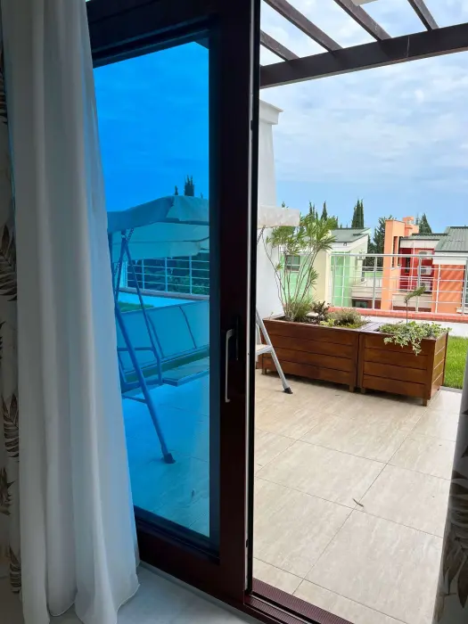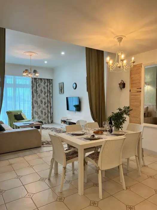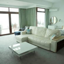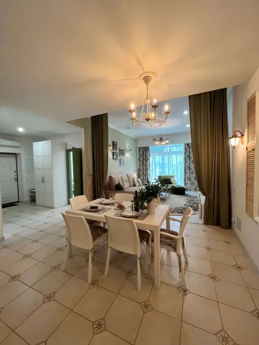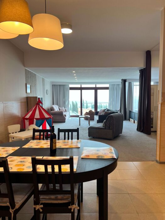Оформлен в легком современном стиле. Попадая в этот апартамент, пространство вокруг вас будто раздвигается. Есть две уютные спальни и из каждой можно попасть на террасу. Панорамные окна, огромная терраса, на которой расположено несколько зон отдыха и стоит обеденный стол, за которым дружной большой семьей можно выпить утренний кофе или устроить праздничный ужин. а можно просто посидеть на качели и почитать книжку из нашей библиотеки.
