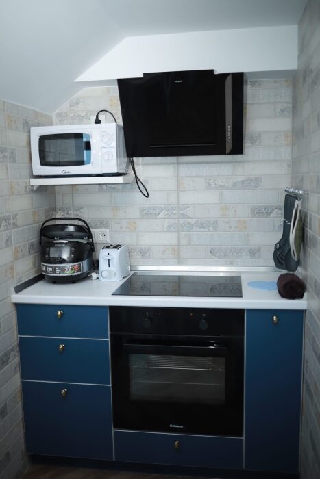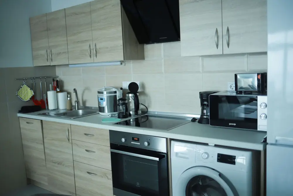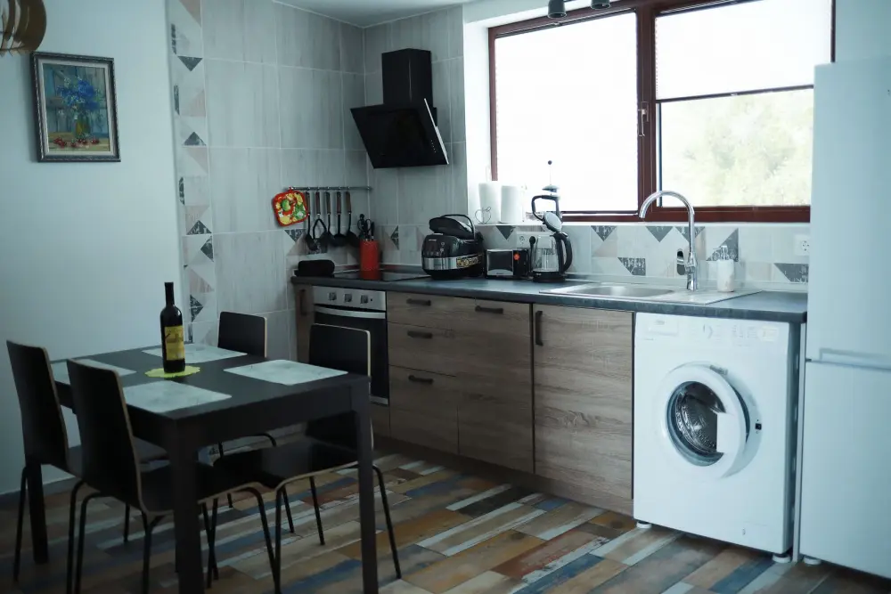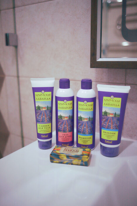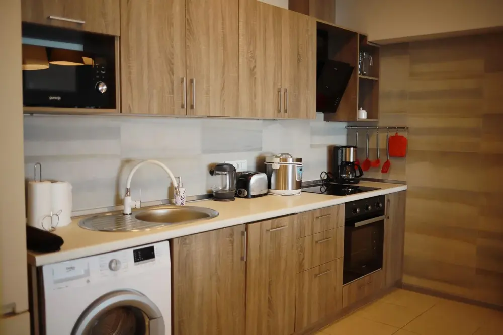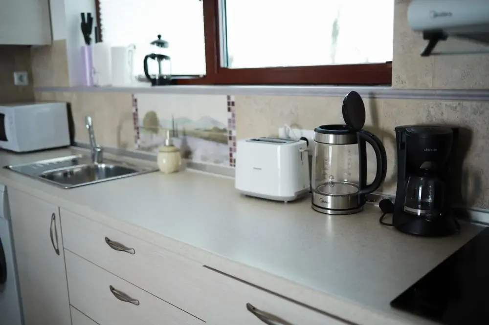 Полный комплект бытовой техники, как дома, приветственный презент: бутылка крымского вина и крымский чай.