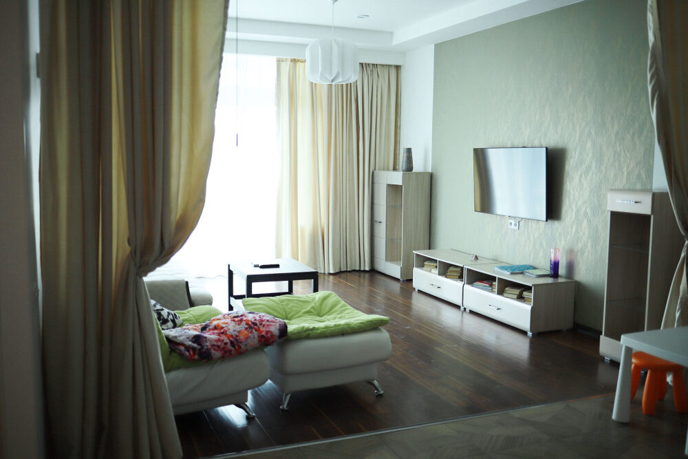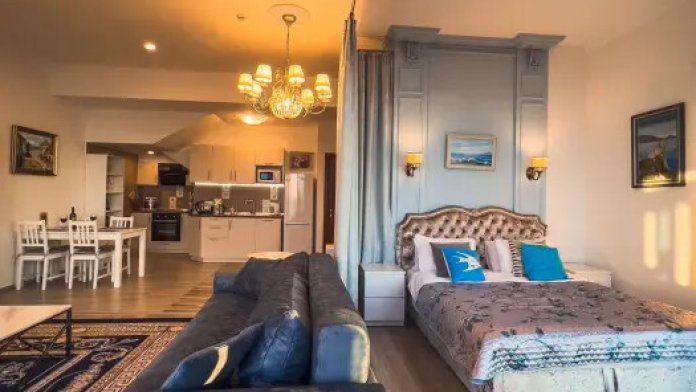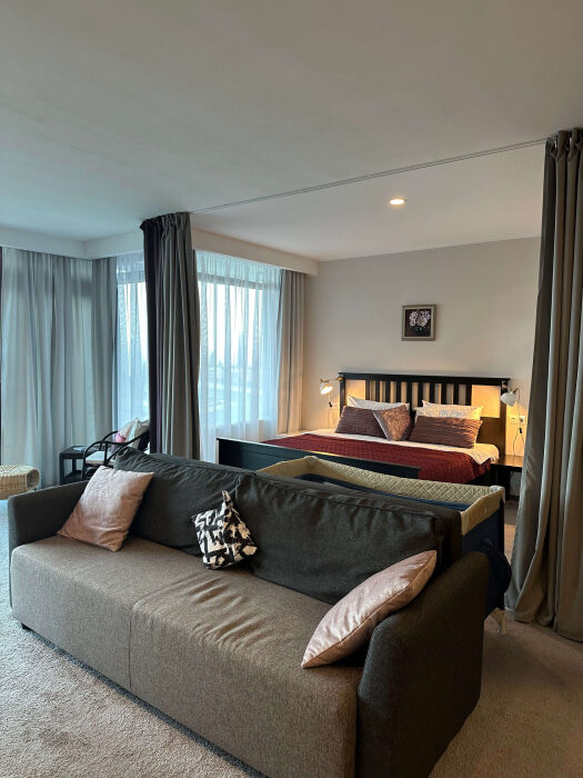 Самый большой апартамент студийного типа. Апартамент поделен на несколько зон: игровая, 2 спальные, кухня и гостиная. В нем нет межкомнатных стен, но для вашего комфорта и уюта спальные места можно деликатно оградить имеющейся шторой.