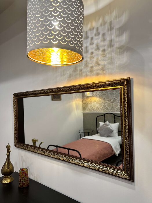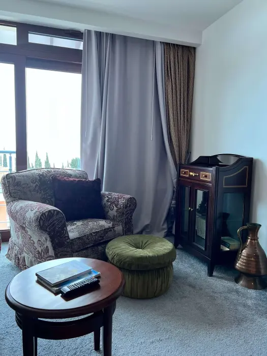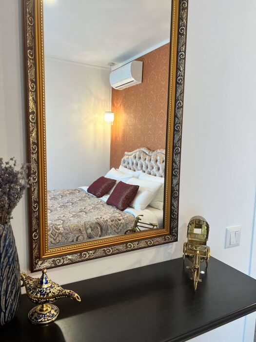 Этот апартамент оформлен в восточном стиле. При входе вас будет встречать птица-павлин, на стене настоящий ковер у кровати тумбочки ручной работы а у зеркала настоящая лампа Алладина, можно загадывать желание. Ведь этот апартамент - это настоящая восточная сказка. А море за огромными панорамными окнами, только усиливает эффект ожидания чуда.