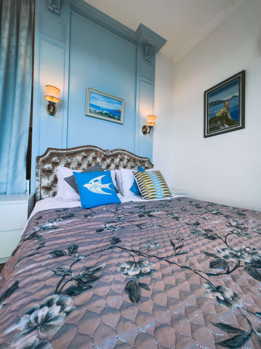 Роскошный апартамент в весенних оттенках цветущей Крымской глицинии. В нем будто чувствуется тот самый неповторимый аромат чудного растения — сладкий и нежный, слегка отдающий мёдом. Вид из панорамных окон на морскую гладь ложится идеальным завершающим мазком, как на картине.