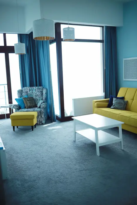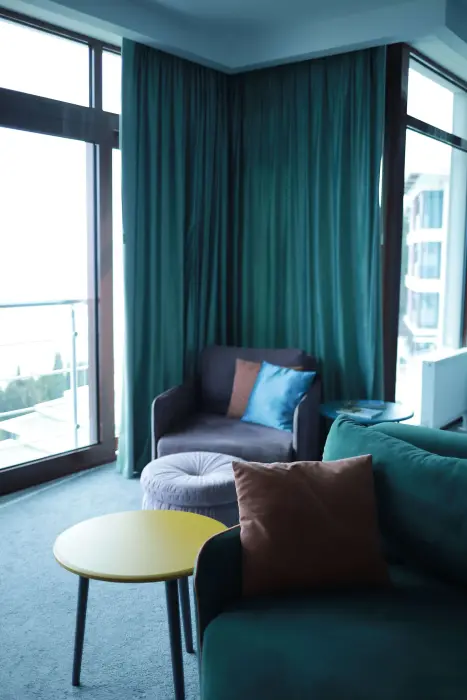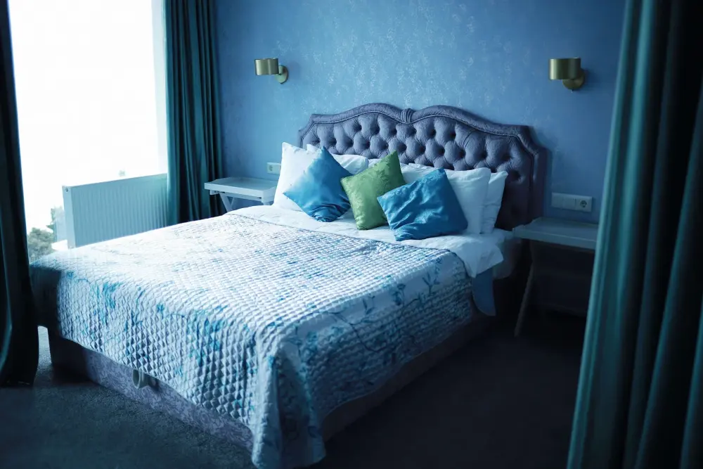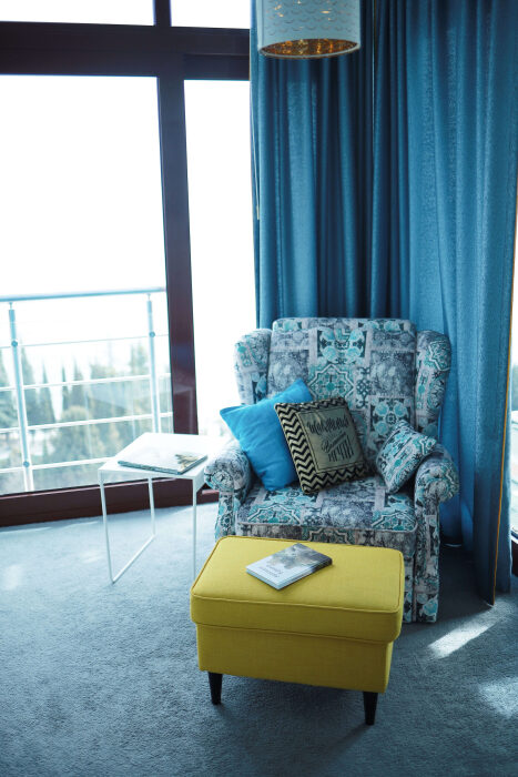 Оформлен в небесно-голубом цвете, в стиле бохо. Очень яркий и жизнерадостный Попадая в это пространство, вы будто оказываетесь в сказке. Из огромных панорамных окон открывается великолепный вид на море, занавески, словно паруса раздувает легкий морской бриз. А расположившись в кресле у окна, можно взять книгу из небольшой библиотеки и расслабиться перелистывая странички.