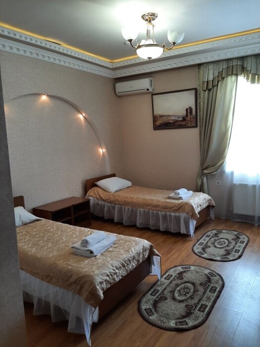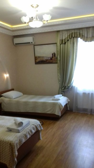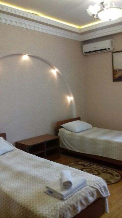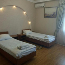 Две односпальные кровати, письменный стол, кондиционер, телевизор, спутниковое ЕВ, телефон, мини-холодильник, эл.чайник, фен, сан. узел, душевая кабинка, зона WI-FI.