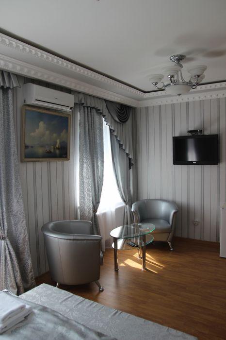 Номер «Полулюкс» - просторный однокомнатный номер, выполнен в приятных бело-серебряных тонах.