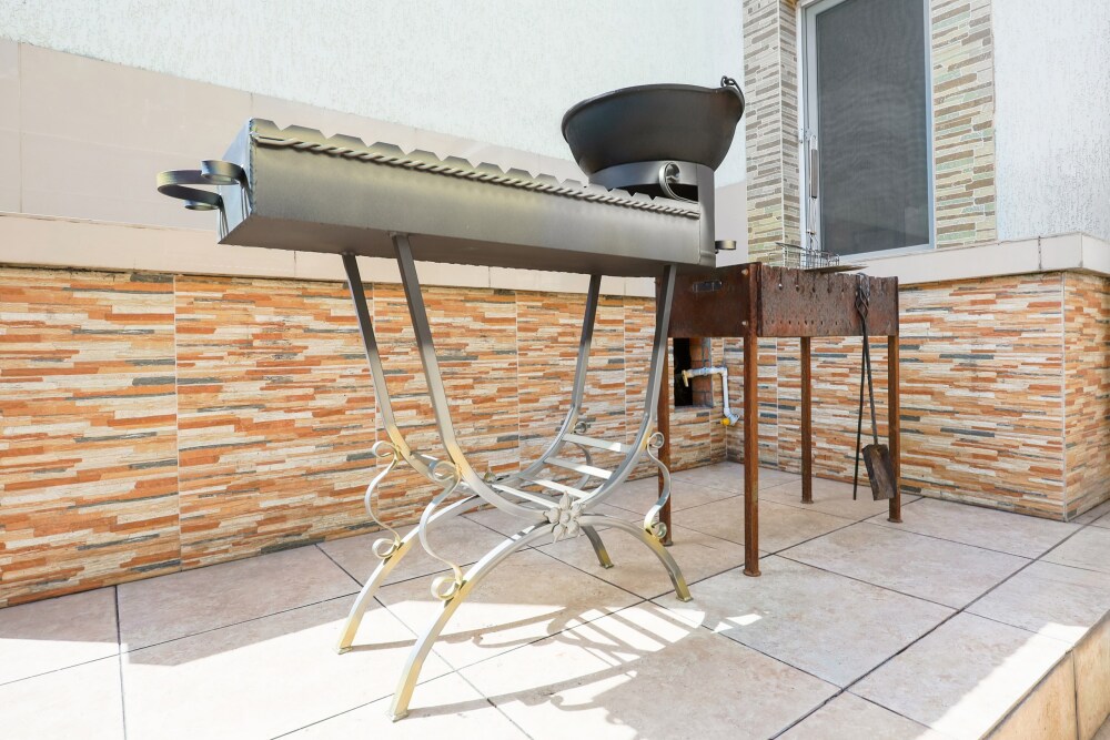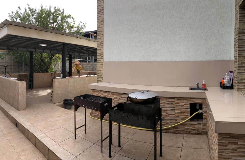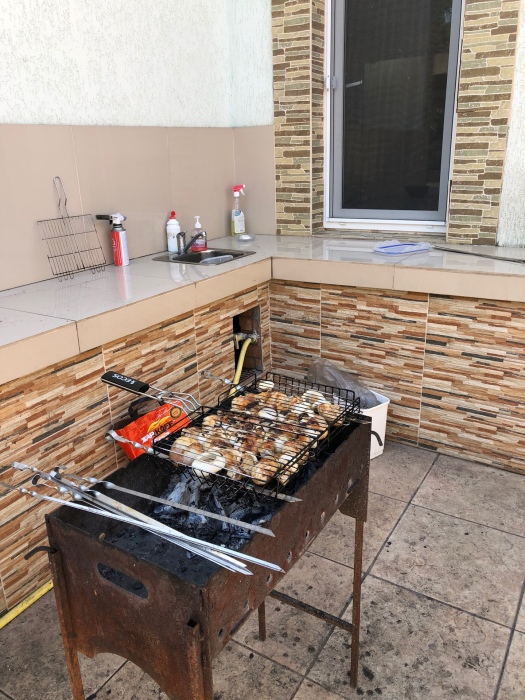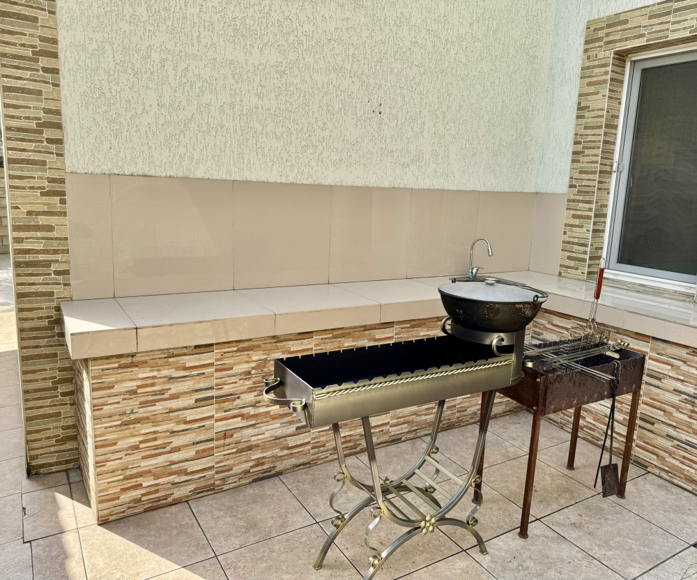 •Мангальная зона: Приготовьте вкусный ужин на свежем воздухе с полным набором оборудования — 2 мангала, большой разделочный стол с горячей водой, шампуры, решетки-гриль, газовая горелка и казан.