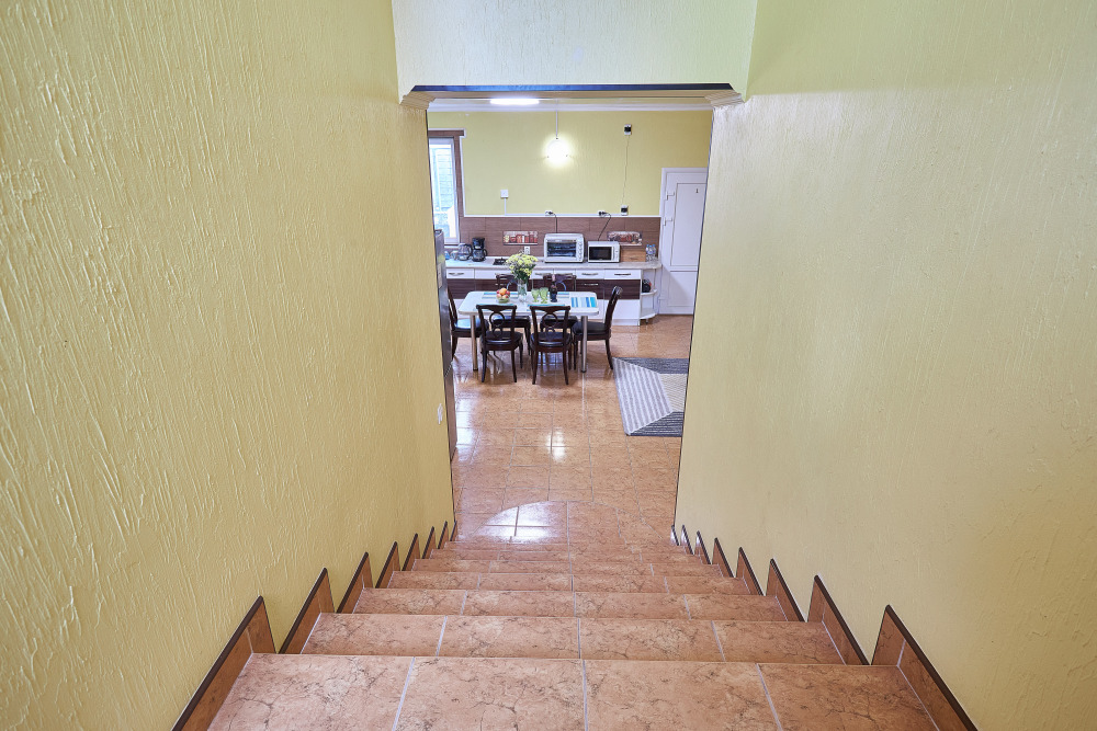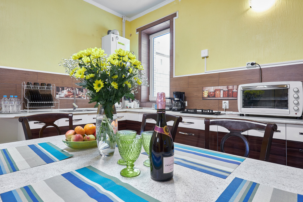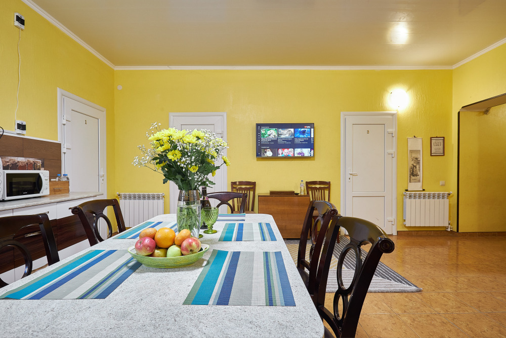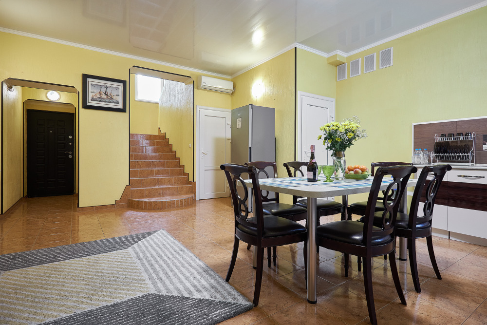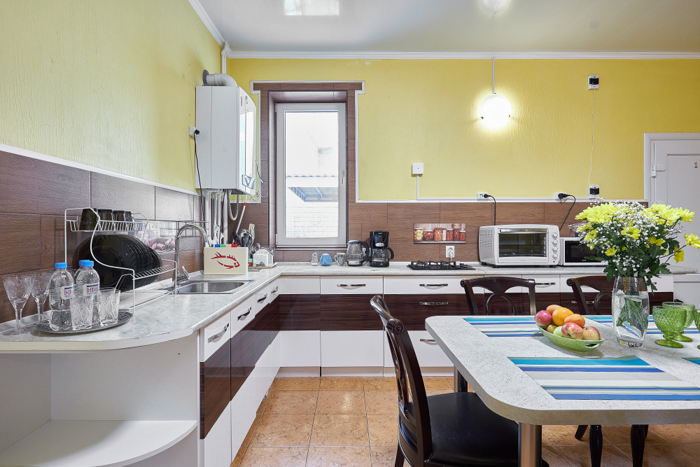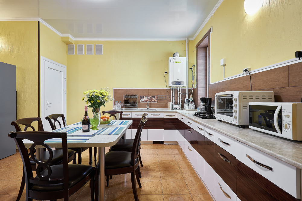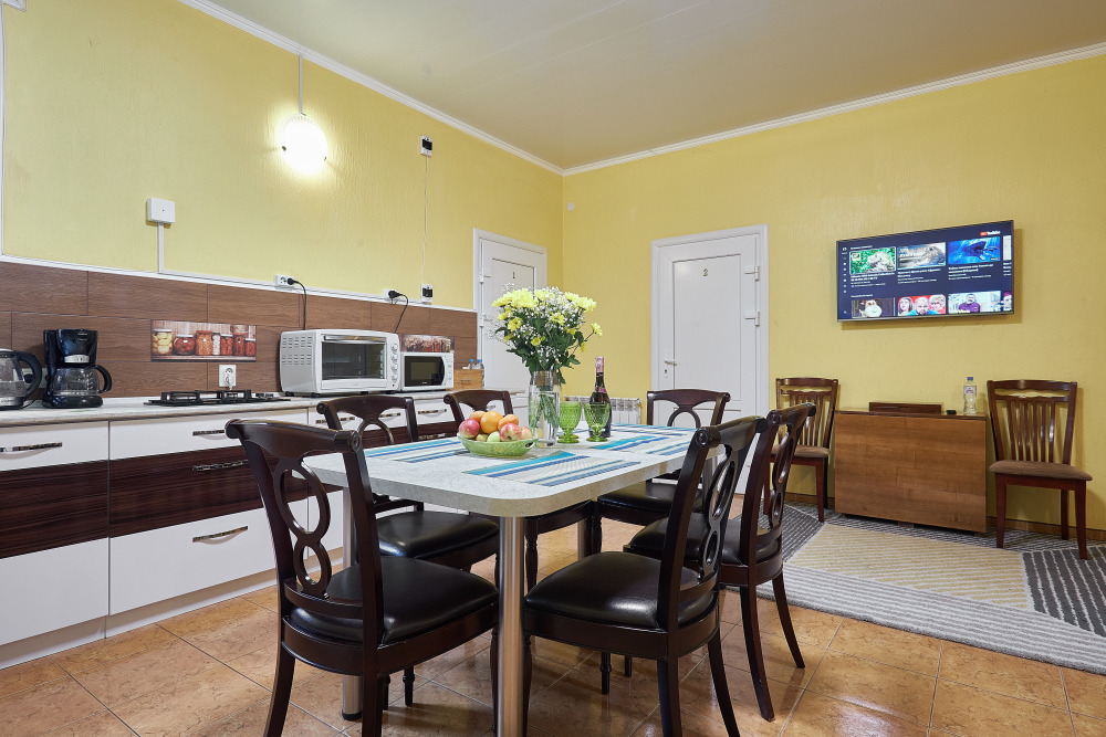 •Кухня-гостиная: Просторная зона со всем необходимым оборудованием, посудой и приборами, двумя столами на 12 персон — лучшее место для ваших кулинарных экспериментов и различных мероприятий.