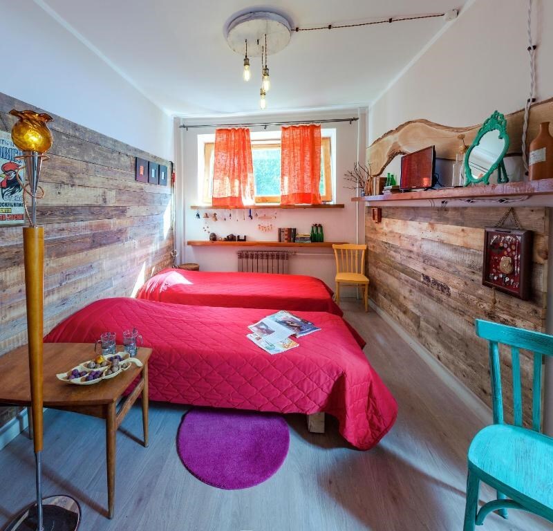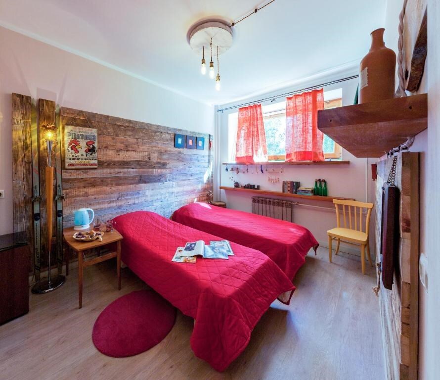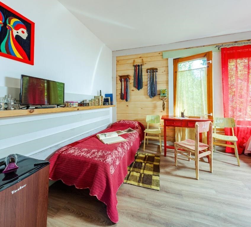 Однокомнатный комфортный номер с двумя односпальными кроватями в даче-отеле в стиле 30-х гг «Гранж Авангард». В номере - две тумбочки, холодильник, телевизор, электрочайник, фен, тапочки. Ванная комната с душем и туалетом.