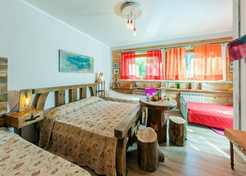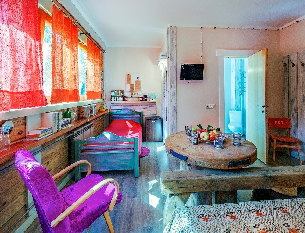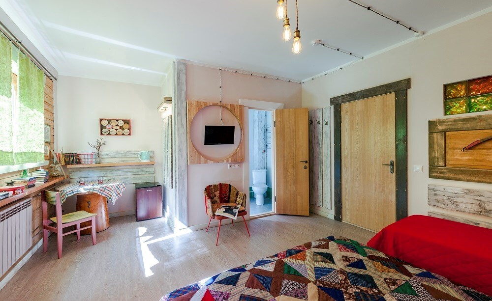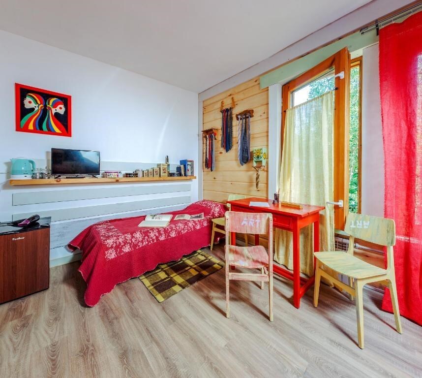 Однокомнатный комфортный номер с одной двуспальной и одной односпальной кроватью в даче-отеле в стиле 30-х гг «Гранж Авангард». В номере - две тумбочки, два стула, стол, холодильник, телевизор, электрочайник. Ванная комната с душем и туалетом.