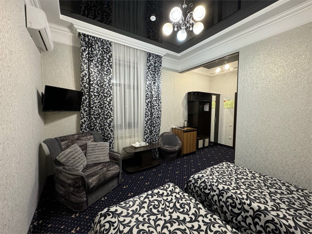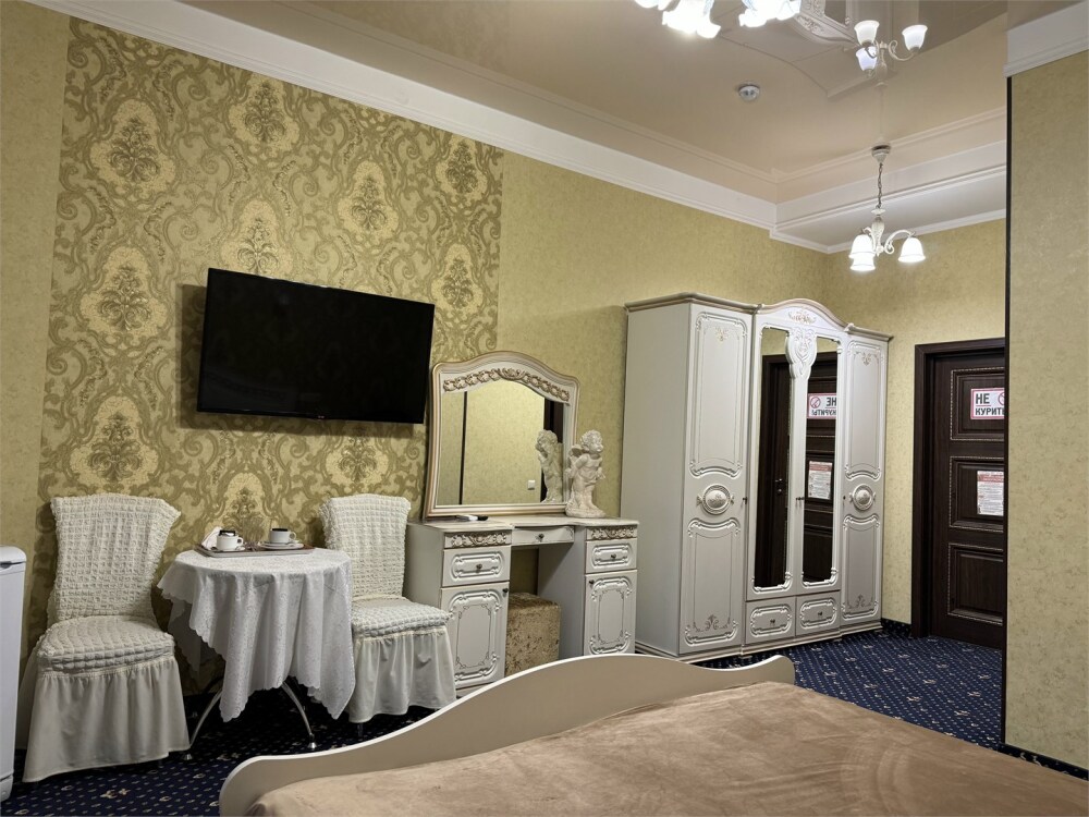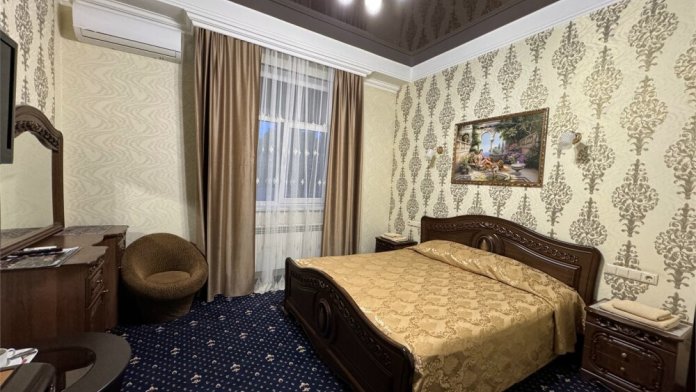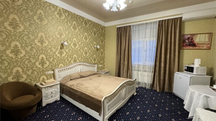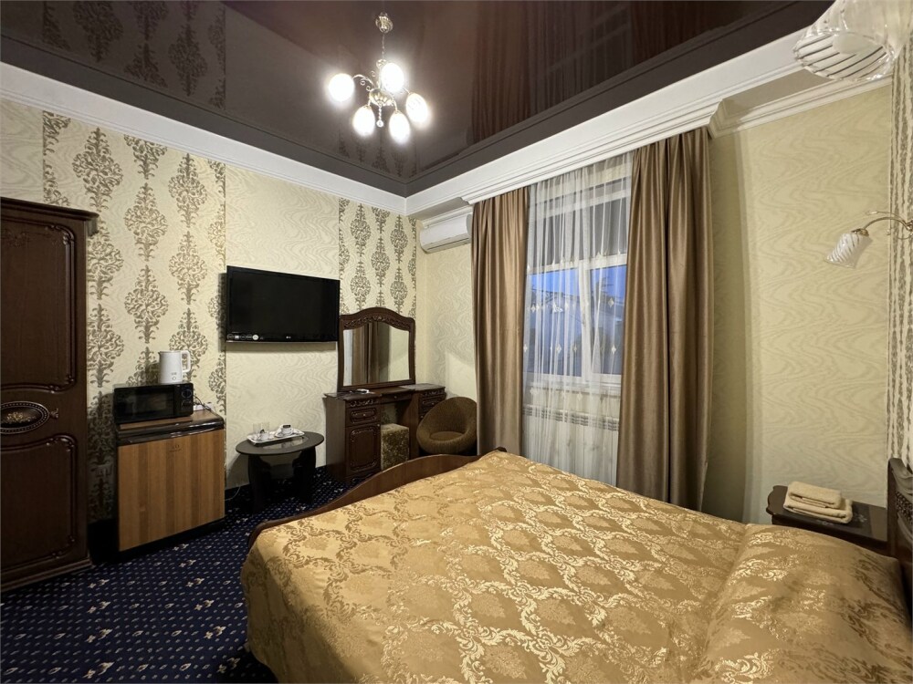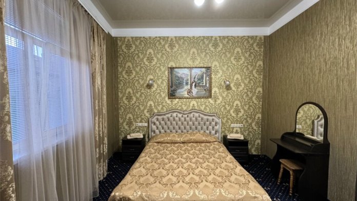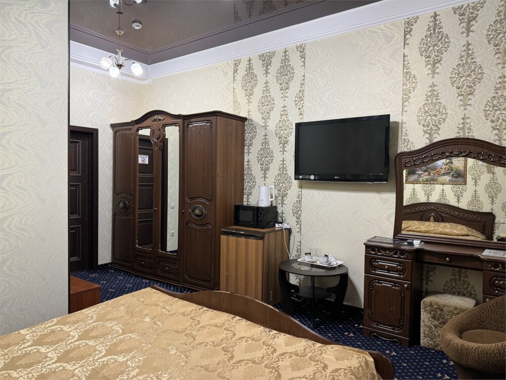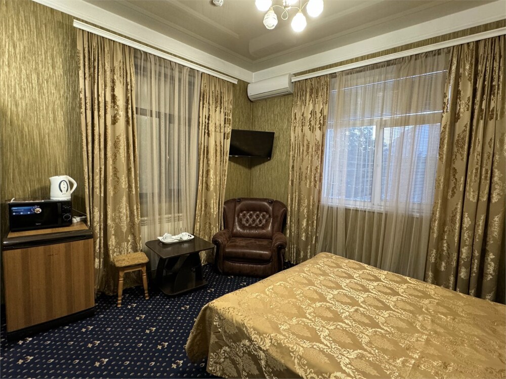 Остановившись в номере «Люкс» гостевого дома «ROYAL», Вы окунетесь в атмосферу роскоши и уюта. Каждый деталь интерьера тщательно продуман, чтобы создать гармоничное пространство для Вашего отдыха. В номере также есть холодильник, микроволновая печь и электрочайник для Вашего удобства. Телевизор и кондиционер в номере помогут вам наслаждаться комфортным пребыванием в отеле. Вы сможете наслаждаться просмотром любимых фильмов или передач и создать приятную атмосферу в номере. Вы сможете насладиться роскошью и комфортом, оставив за стенами гостиницы все трудности и заботы. Здесь Вы найдете все, что нужно для комфортного отдыха и полного расслабления!
