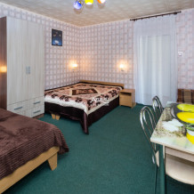 Балкон общий. Кухня общая на три номера на этаже: газовая плита, СВЧ, большой холодильник. Общая на эти три номера столовая с индивидуальными столиками.