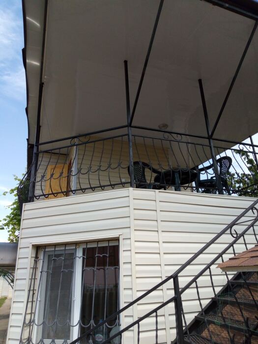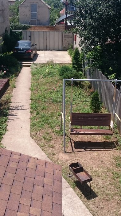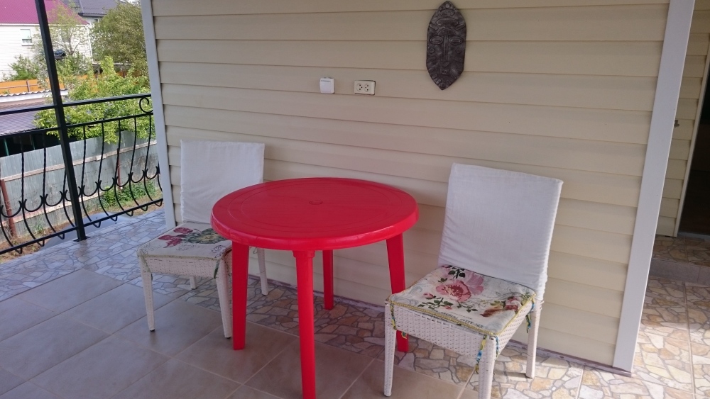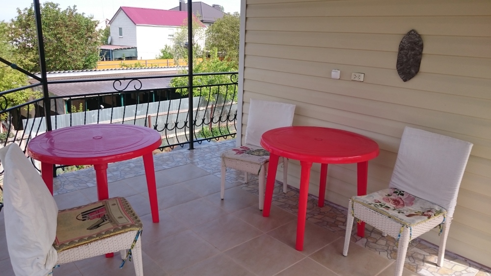 В номере кондиционер, телевизор, вай-фай. Сан.узел раздельный, рассчитан на 2 номера. Находится рядом с номером на втором этаже. Есть дополнительные душ и туалет на первом этаже. Кухня общая для четырех номеров. Питание самостоятельное. Номер выходит на террасу. Во дворе беседки, зона барбекю, детский уголок, бесплатная парковка.