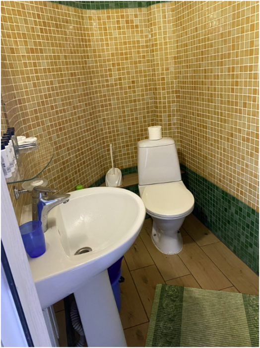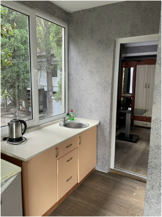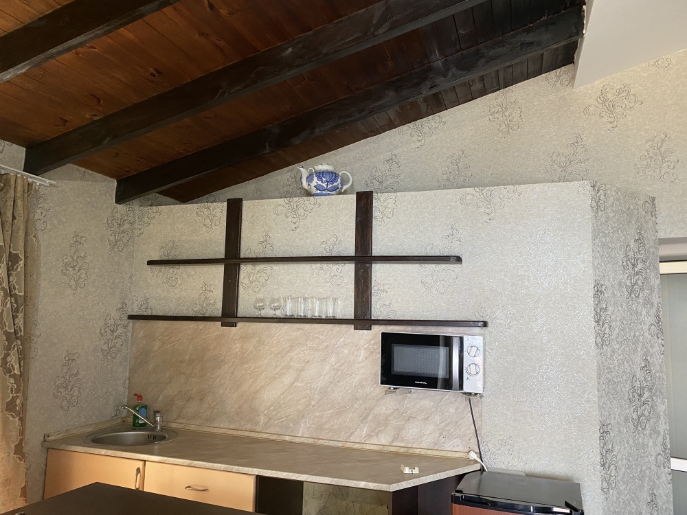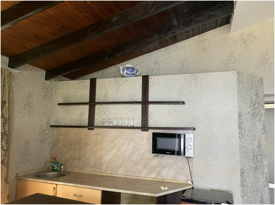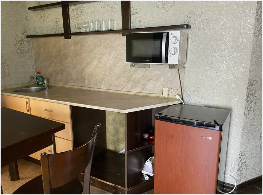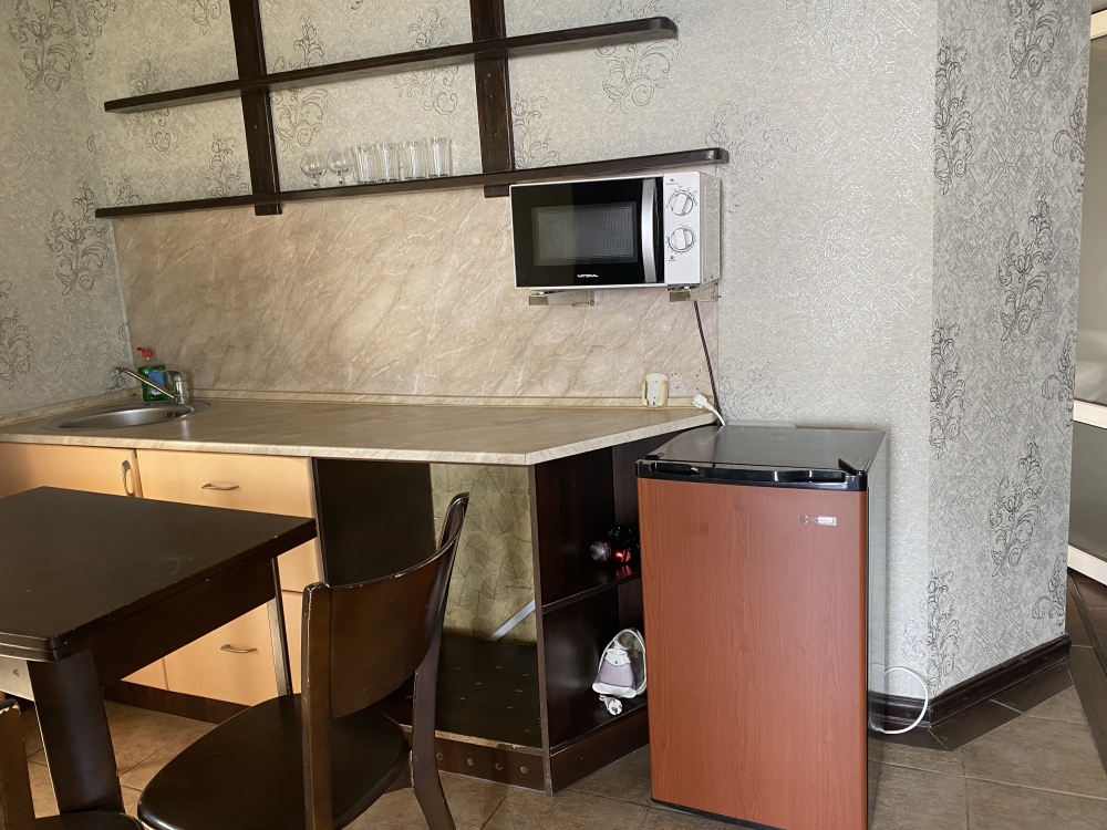 Есть мини-кухня: раковина, электрочайник, СВЧ-печь, набор посуды.