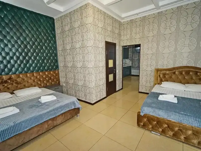 Номер с современной отделкой, оборудован техникой и мебелью: двуспальная или односпальные кровати, два диван-кровать, шкаф, прикроватные тумбочки, столик или комод, стулья, зеркало, санузел совмещенный, постельное бельё, полотенца, телевизор, холодильник, кондиционер, балкон (уточнять). Стоимость указана за проживание четверых человек. За каждого последующего человека доплата к прайсу.