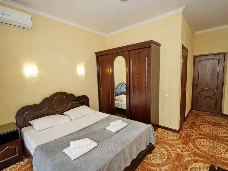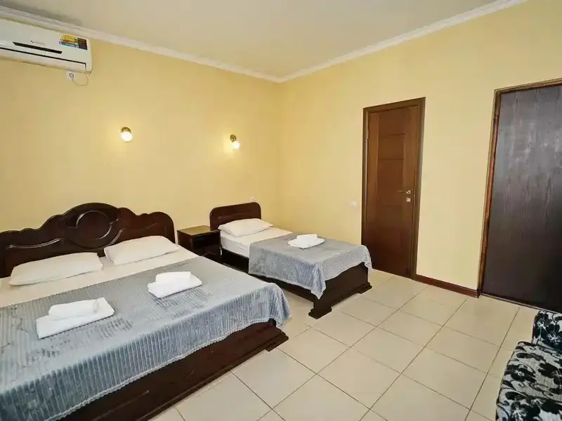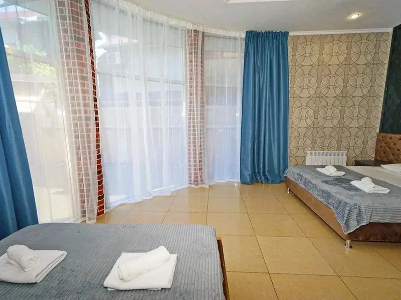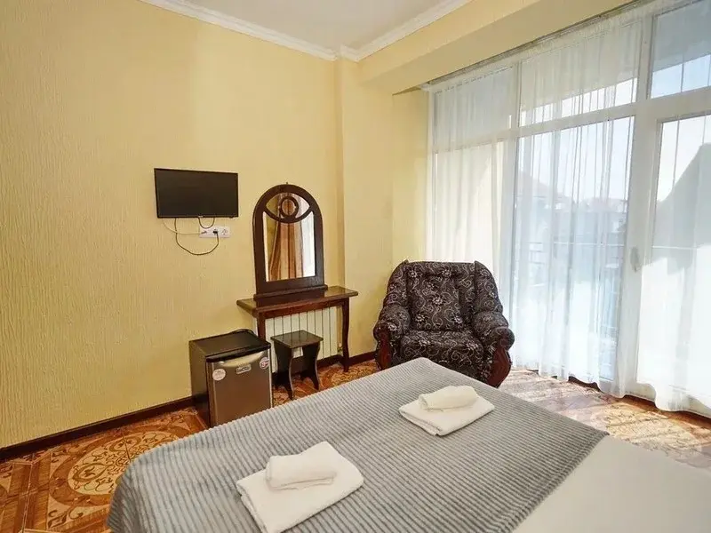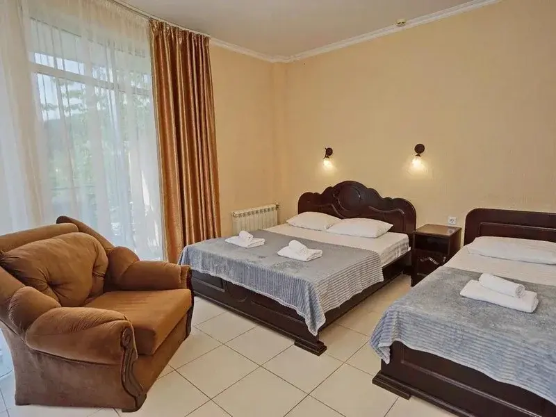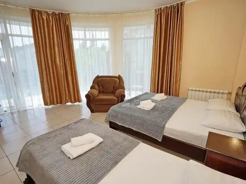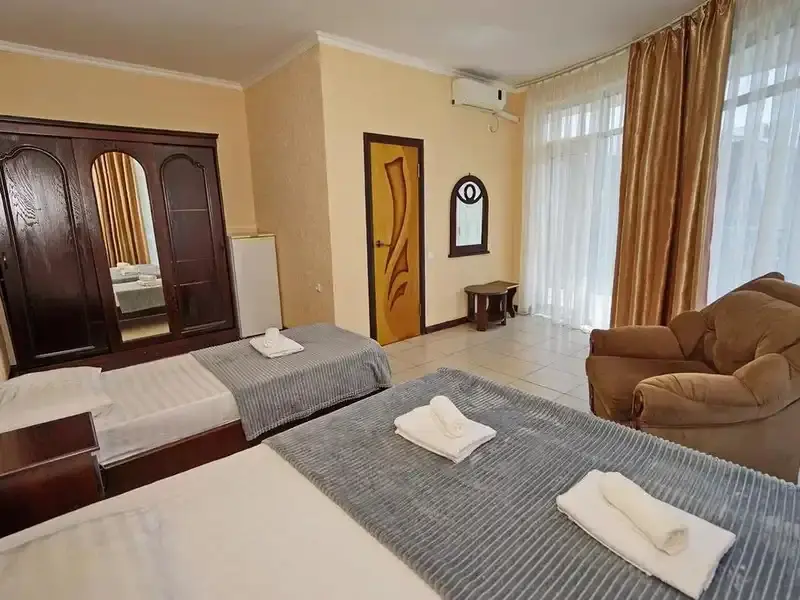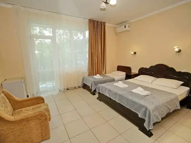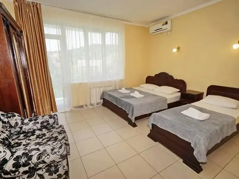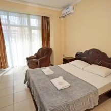 До побережья Черного моря - всего 800 метров (около 12-15 минут прогулки). Дорога к морю проходит по благоустроенным улицам, а обратный путь который не требует больших усилий, станет приятной завершающей точкой морского дня. Сам Гостевой дом представляет собой четырехэтажное здание с комфортабельным номерами разных категорий, однокомнатные, двухкомнатные номера с кухнями и без (вместимость номеров от 2-8 человек). Номера очень уютные и просторные, оборудованные всем необходимым: телевизор, кондиционер, холодильник, санузел, балкон (уточнять). Номера с кухней оснащены дополнительной техникой: плита, чайник, стиральная машина, набор посуды.