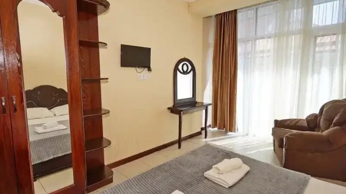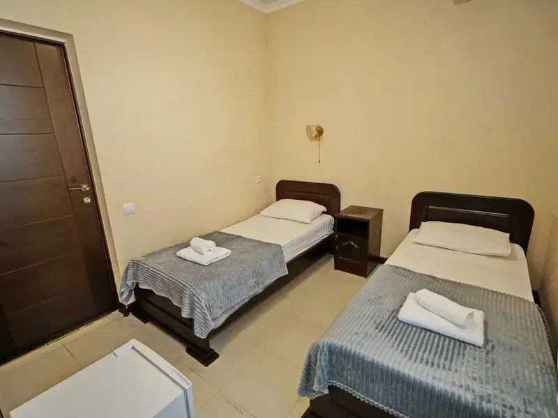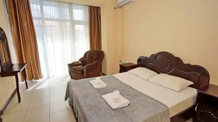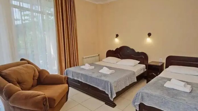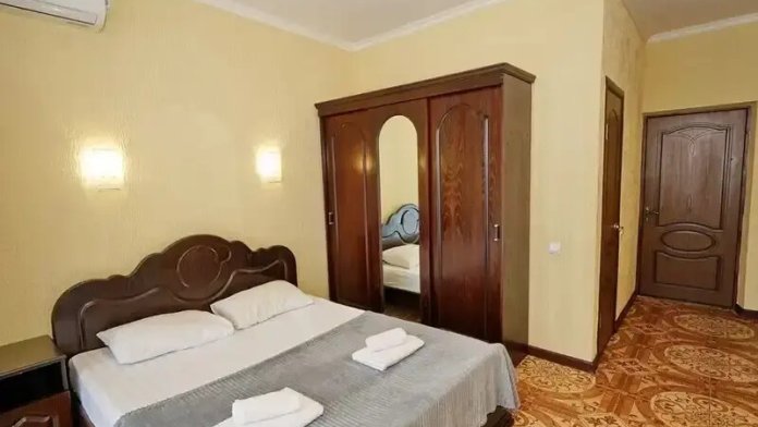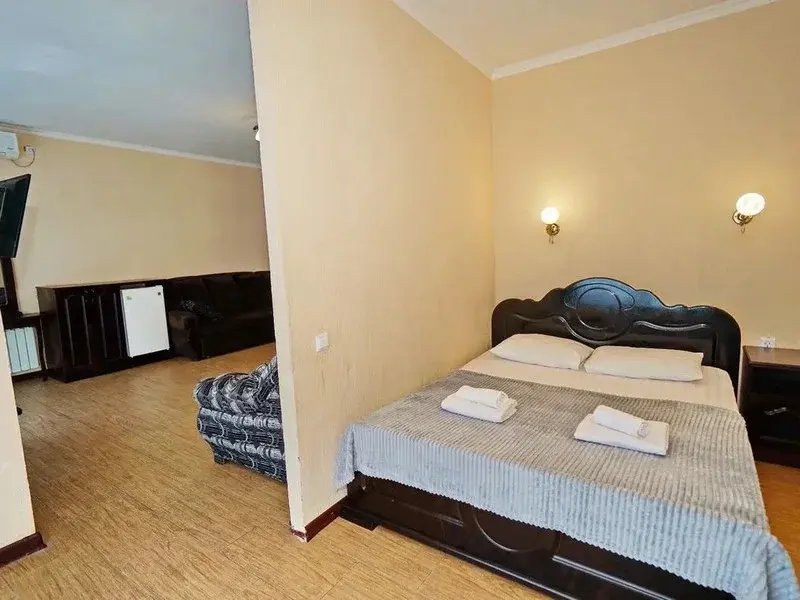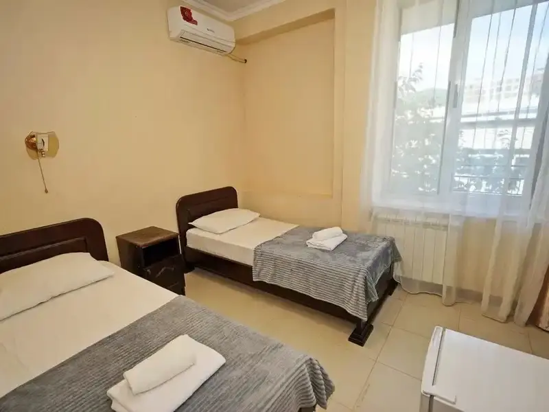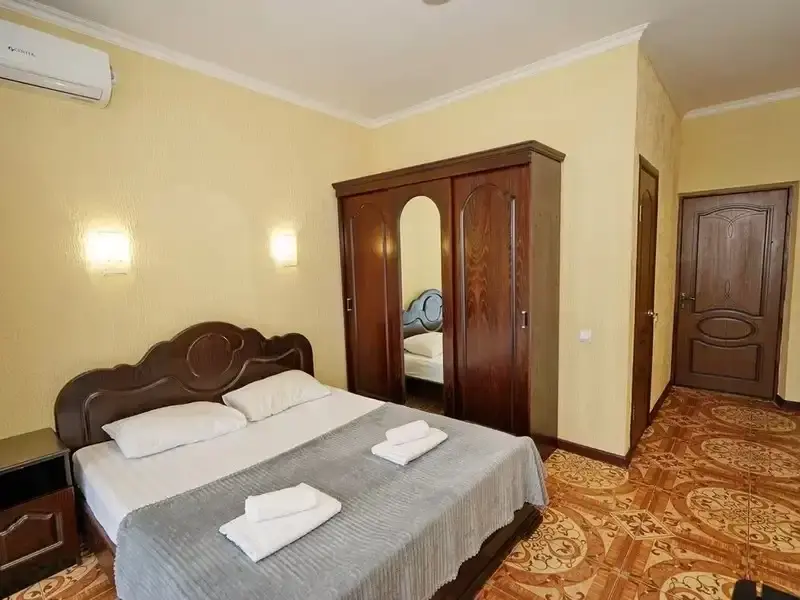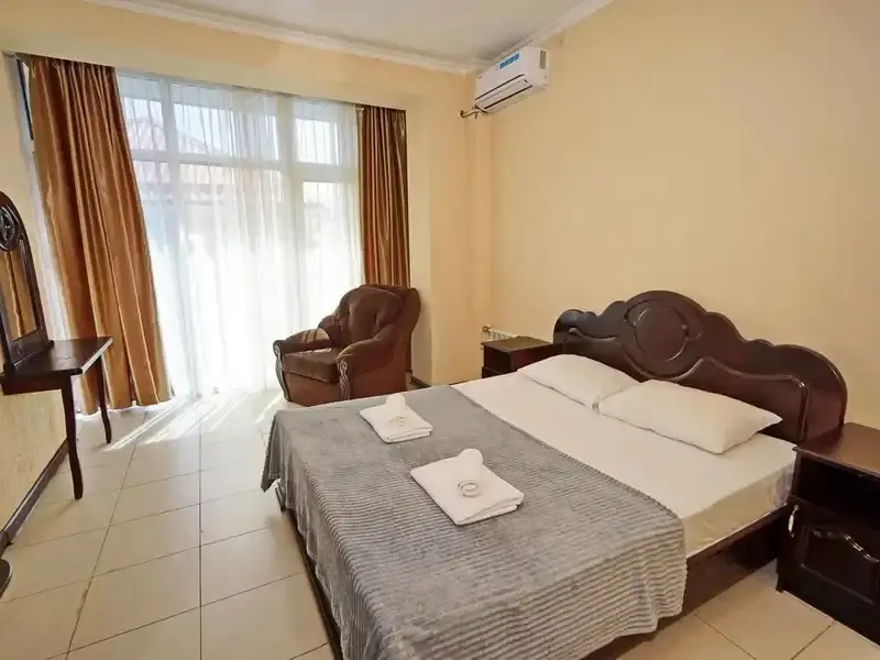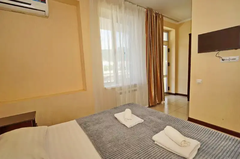 Номер с современной отделкой, оборудованы необходимой техникой и мебелью: двуспальная или односпальные кровати, шкаф, прикроватные тумбочки, столик или комод, стулья, зеркало, санузел совмещенный, постельное бельё, полотенца, телевизор, холодильник, кондиционер, балкон (уточнять).