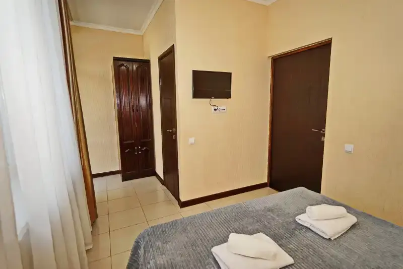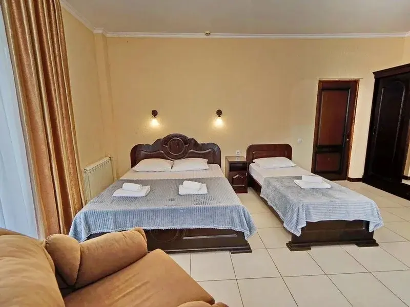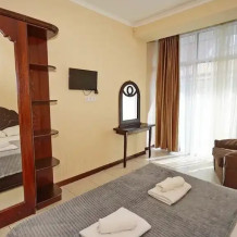 Номер с современной отделкой, оборудованы необходимой техникой и мебелью: двуспальная, односпальные кровати, кресло кровать, шкаф, прикроватные тумбочки, столик или комод, стулья, зеркало, санузел совмещенный, постельное бельё, полотенца, телевизор, холодильник, кондиционер, балкон (уточнять).