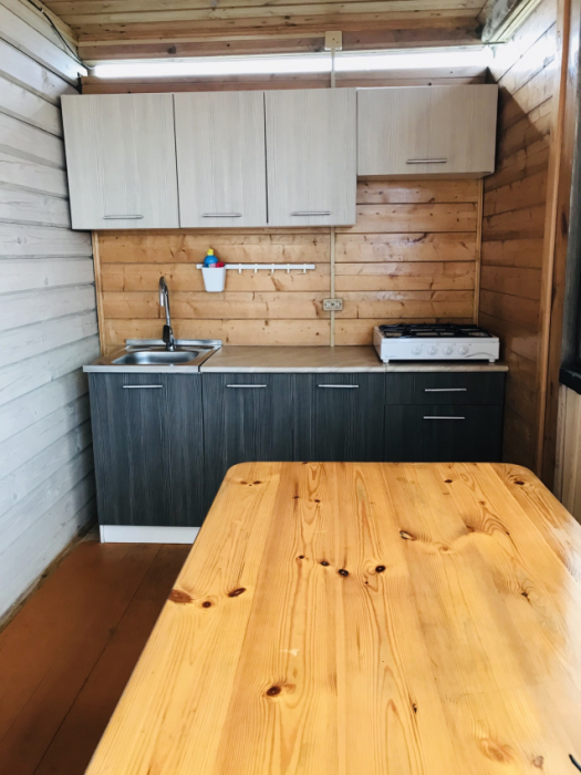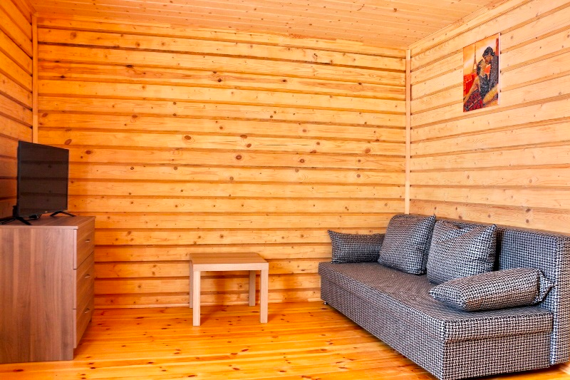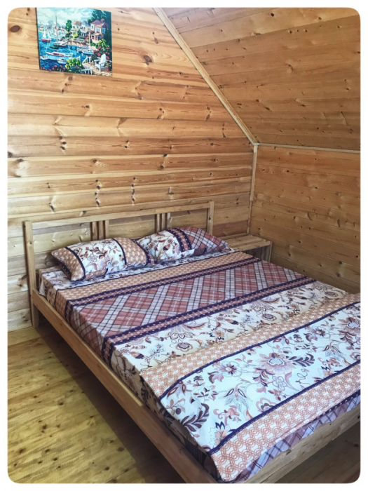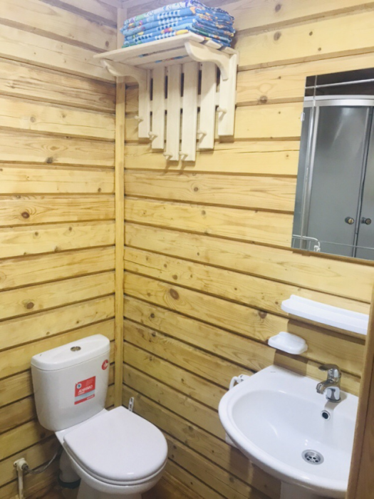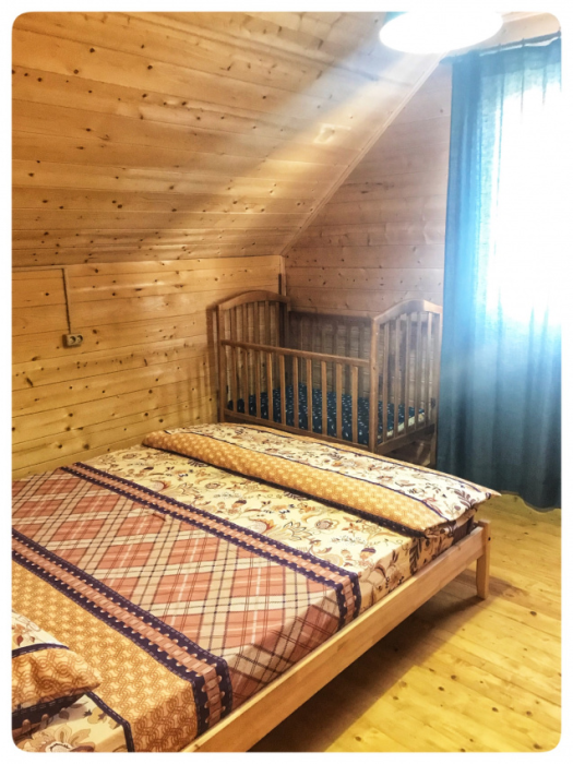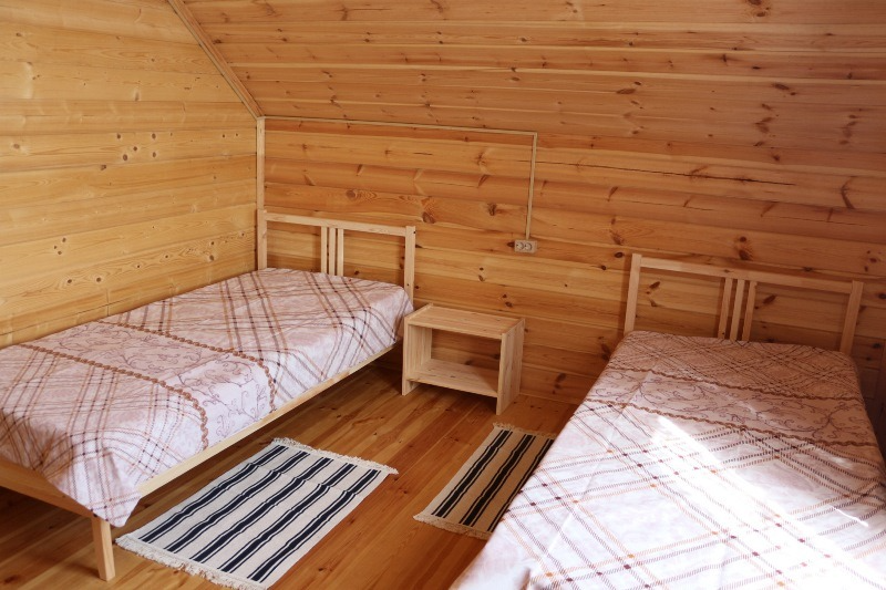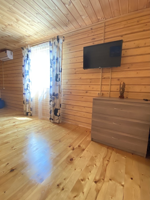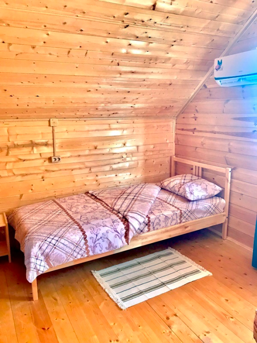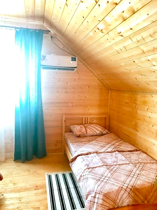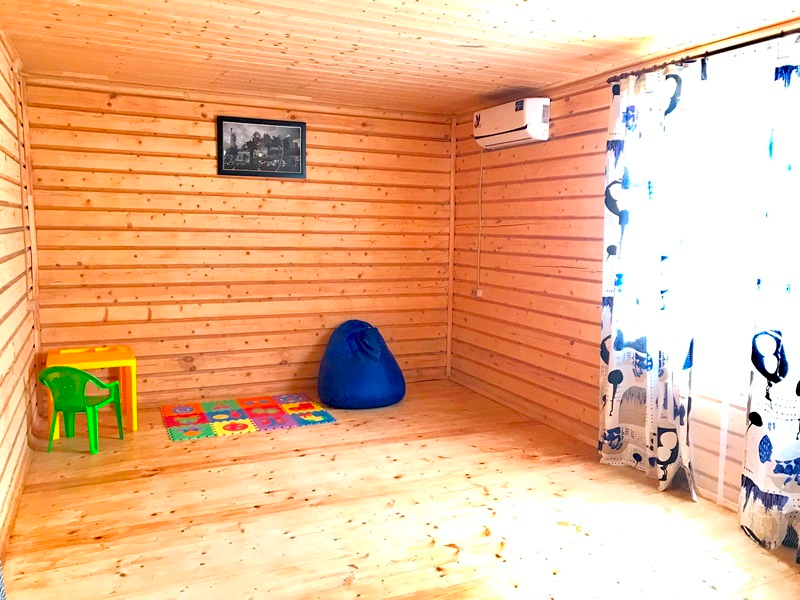 Площадь каждого из домиков 96 кв. м, рассчитан на 10 человек. В доме 3 отдельные, изолированные комнаты, все удобства: сплит-системы в каждой комнате, телевизор, цифровое ТВ, холодильник, СВЧ, электрочайник, детский стул для кормления, гладильные принадлежности, стиральная машина, санузел и душ. Есть детский уголок в комнате на 1-этаже (столик, стульчик, мягкое покрытие на полу).