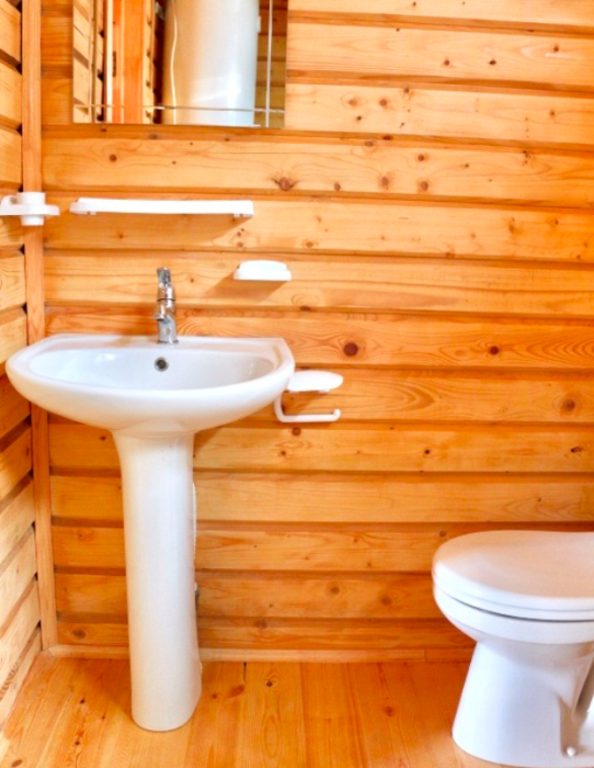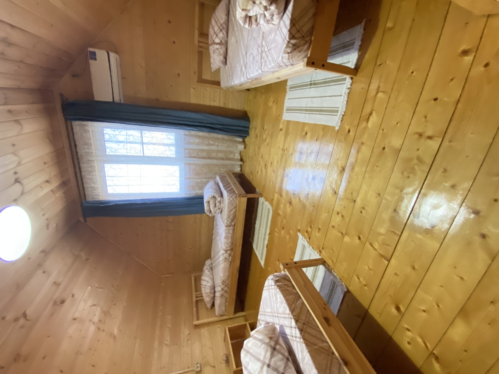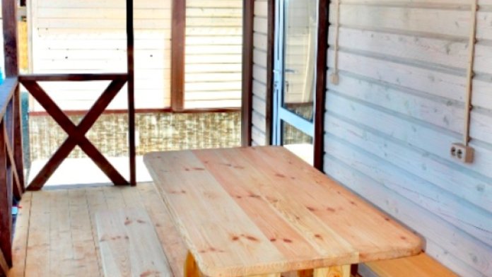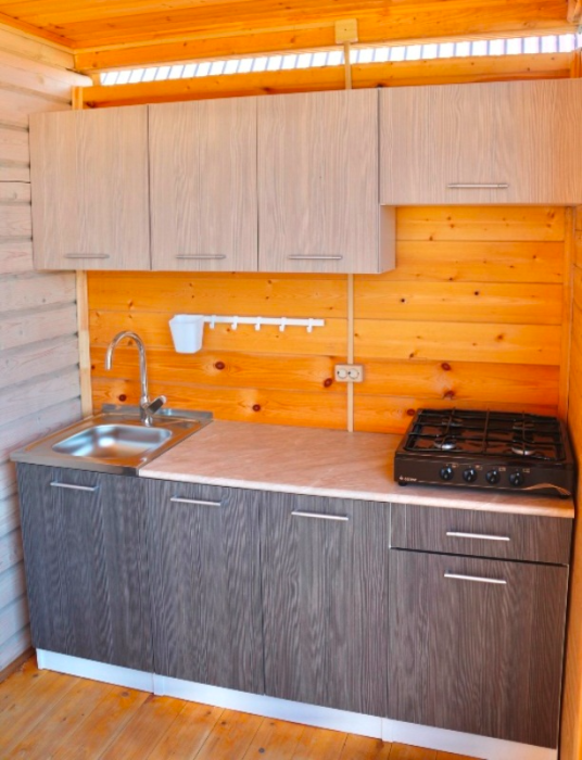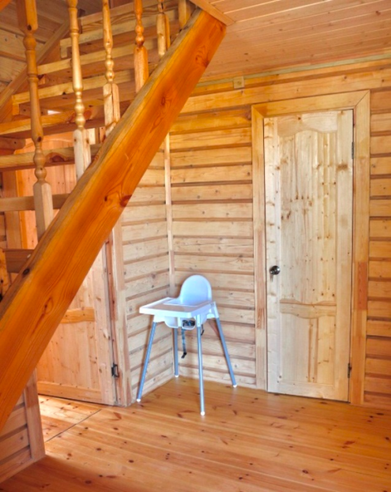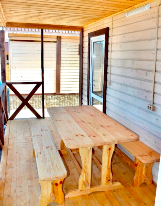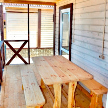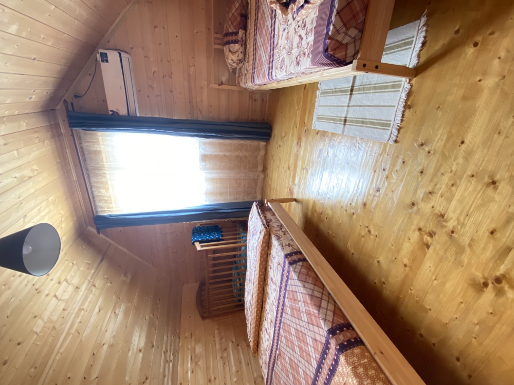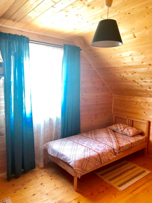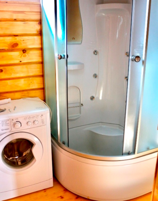 Площадь каждого из домиков 96 кв. м, рассчитан на 10 человек. В доме 3 отдельные, изолированные комнаты, все удобства: сплит-системы в каждой комнате, телевизор, цифровое ТВ, холодильник, СВЧ, электрочайник, детский стул для кормления, гладильные принадлежности, стиральная машина, санузел и душ. Есть детский уголок в комнате на 1-этаже (столик, стульчик, мягкое покрытие на полу).