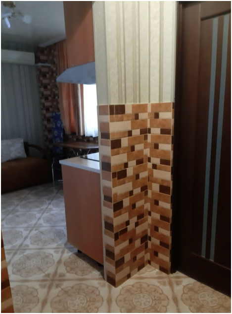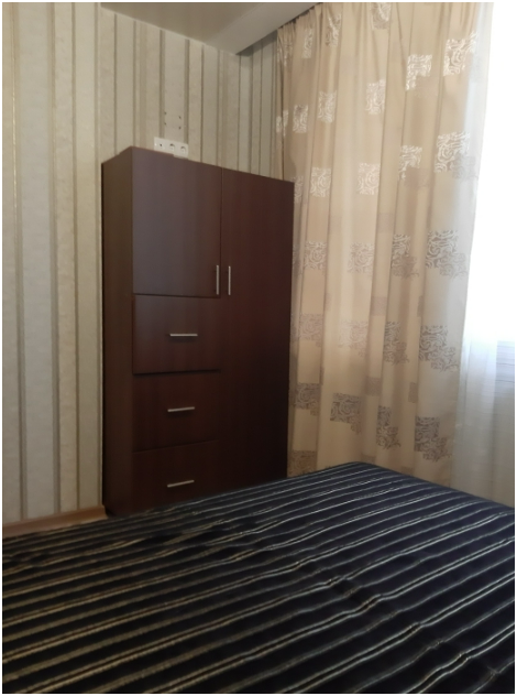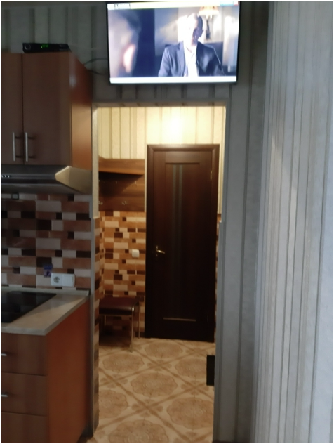 Квартира разделена на две зоны: спальная и гостиная с кухней: кухня- студия укомплектована: электрочайник, микроволновая печь, электроплита 2 конфорки, стол обеденный, 4 табурета, шкафы навесные, столовые приборы, столовая посуда, двуспальный диван, платяной шкаф, утюг, гладильная доска.