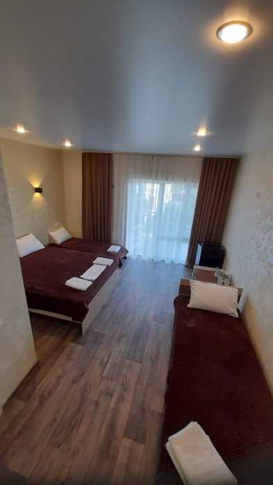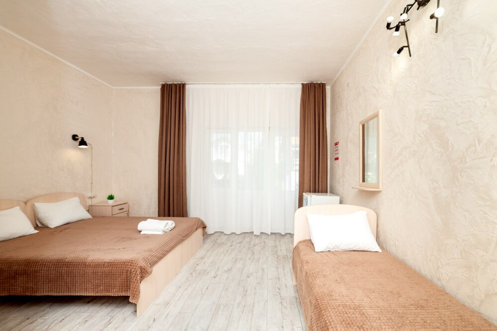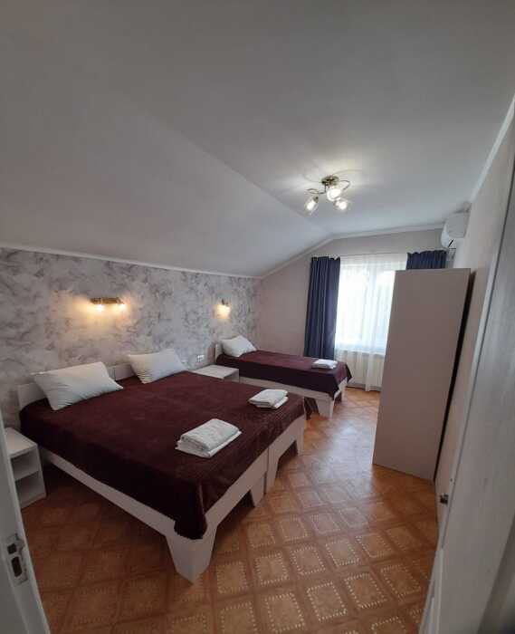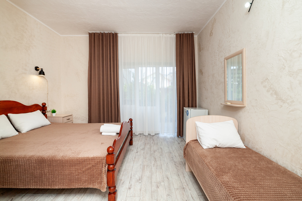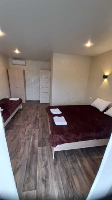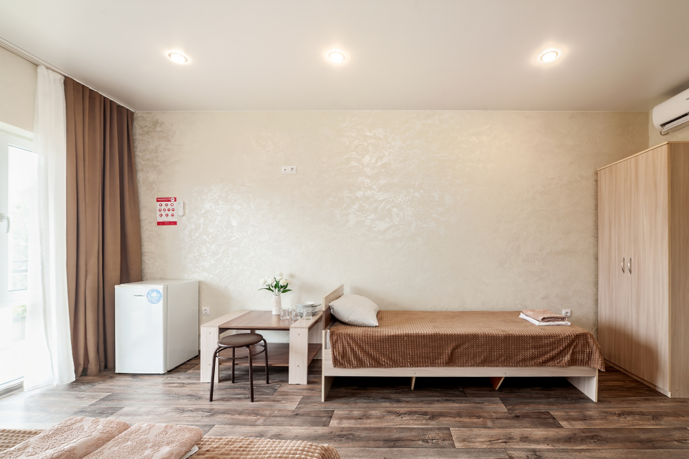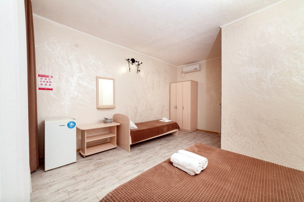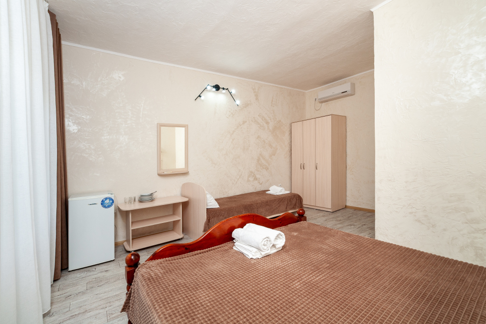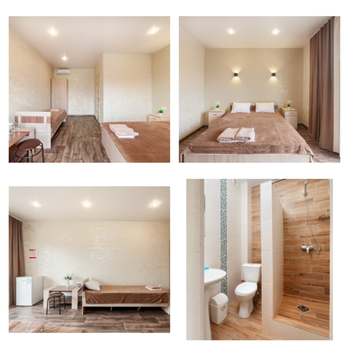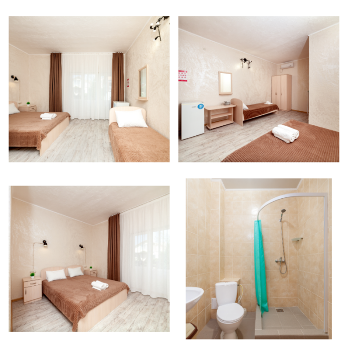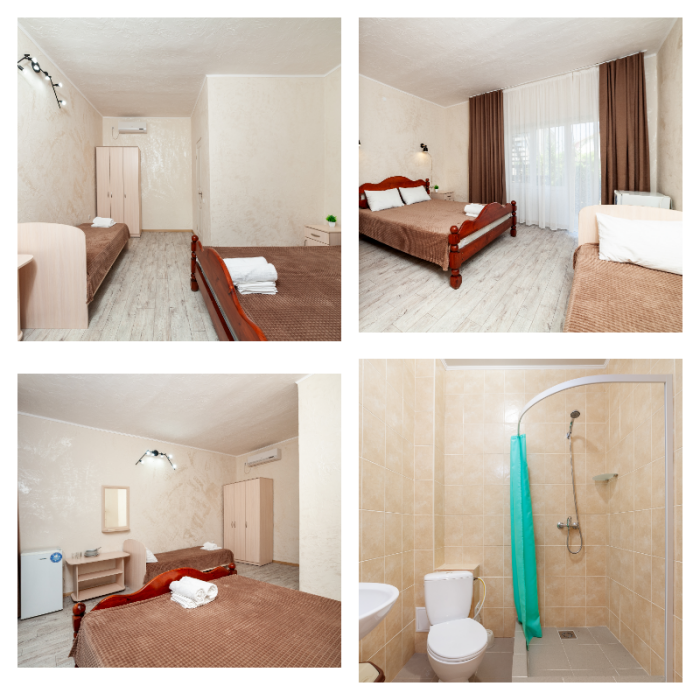 Мы предлагаем 8 номеров Комфорт. Каждый номер на 3 места (возможно дополнительное размещение ребенка на удобную раскладушку-кровать) с отдельным входом. В комнате кондиционер, холодильник, с/у в кафеле совмещенный, S 20 кв. м, посуда по количеству гостей.