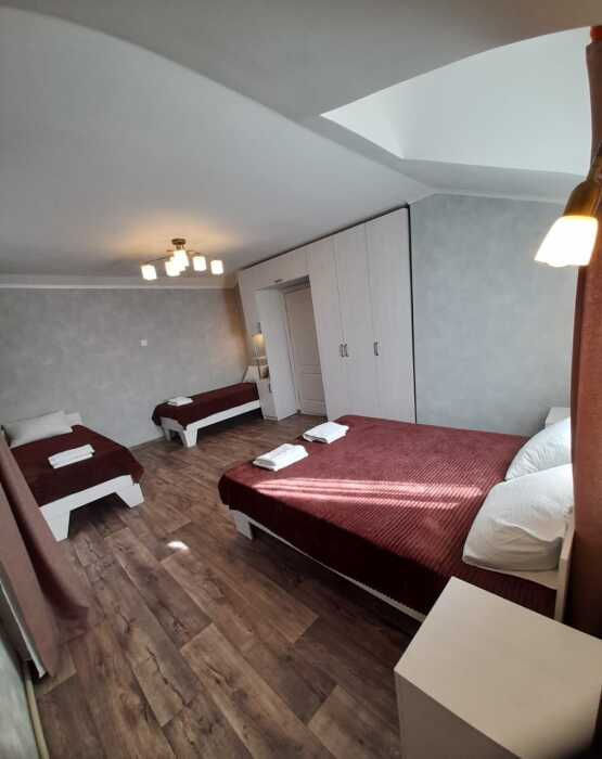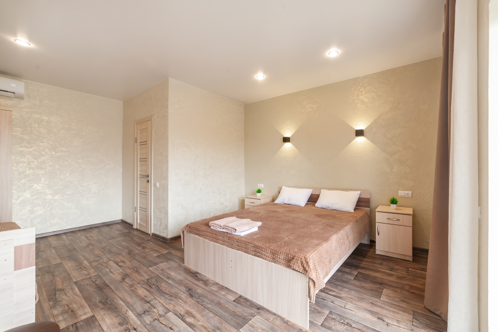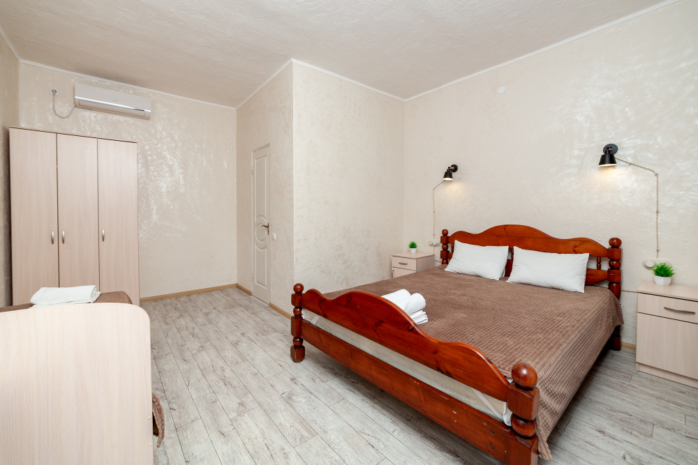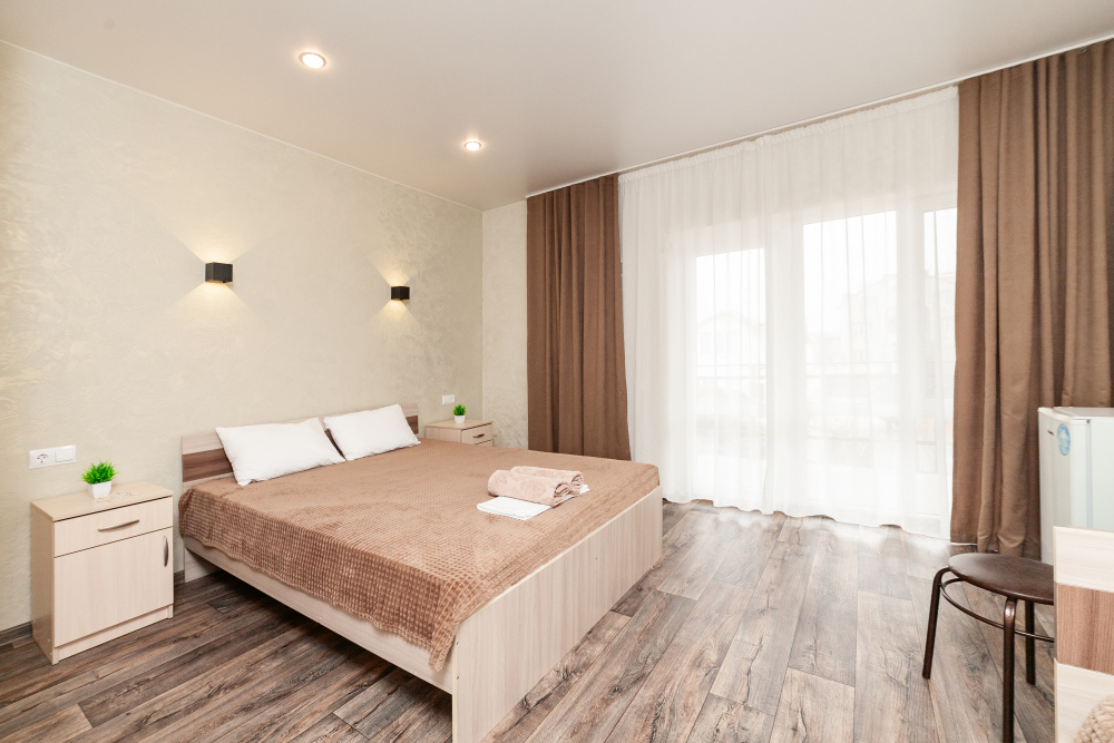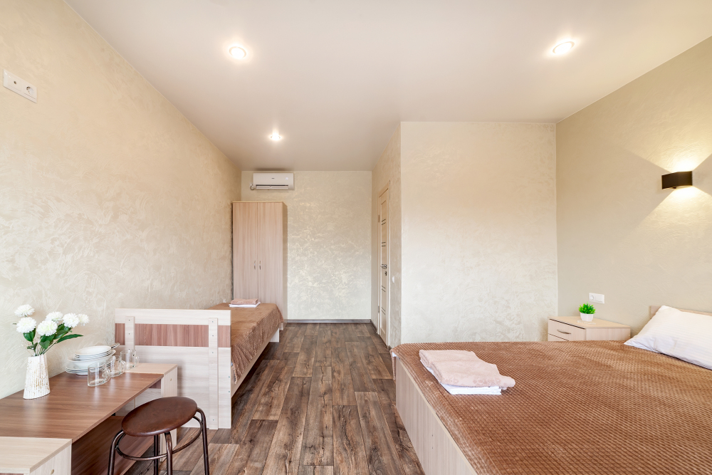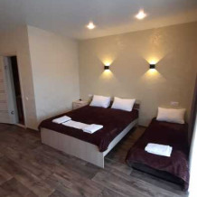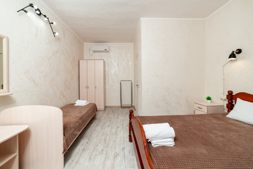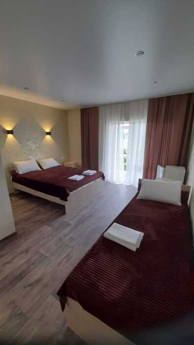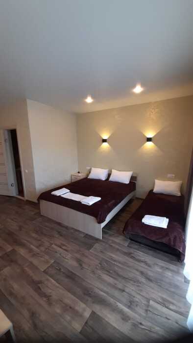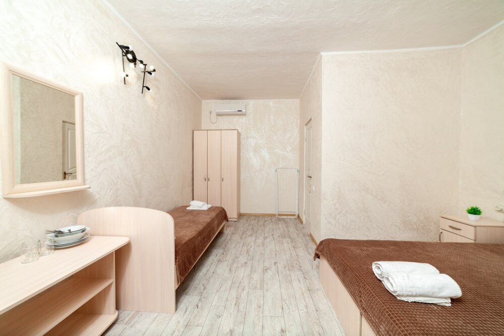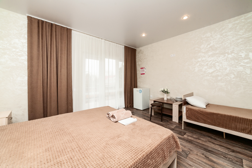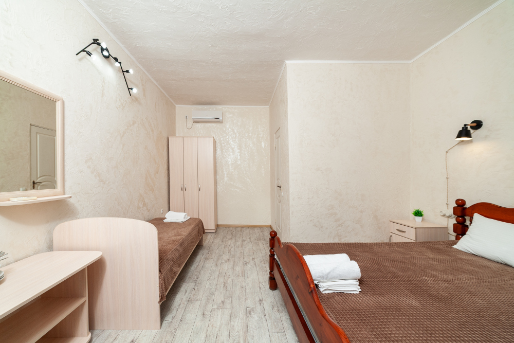 Мы предлагаем 8 номеров Комфорт. Каждый номер на 3 места (возможно дополнительное размещение ребенка на удобную раскладушку-кровать) с отдельным входом. В комнате кондиционер, холодильник, с/у в кафеле совмещенный, S 20 кв. м, посуда по количеству гостей.