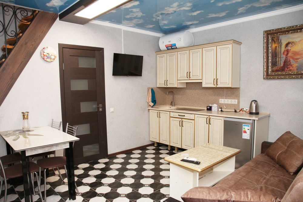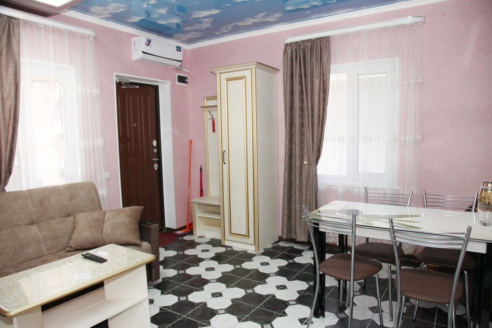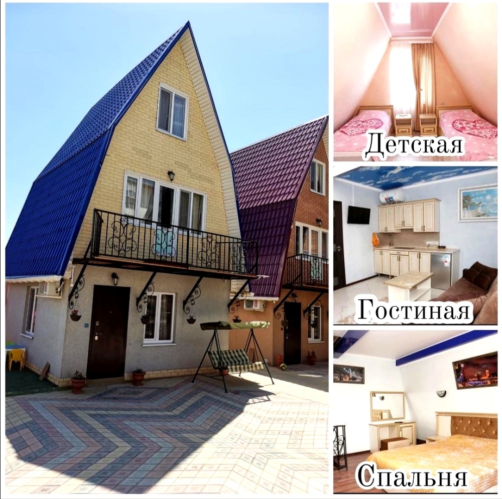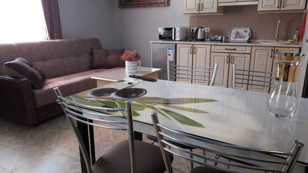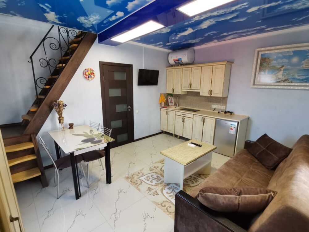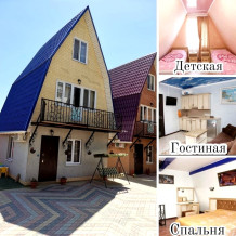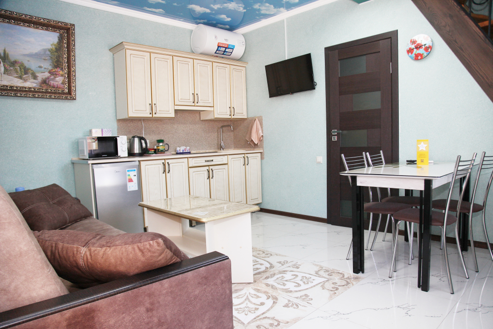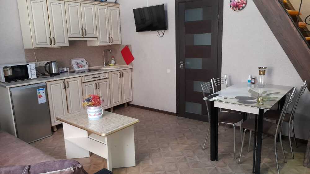 Аппарт-коттедж рассчитан на 6 гостей. Есть возможность размещения 2 доп. мест с доплатой. В каждом коттедже имеется полноценная кухня с посудой, холодильник, TV, спальня с балконом + детская.