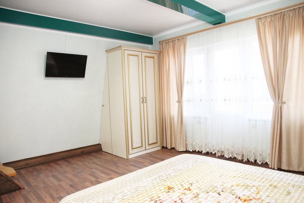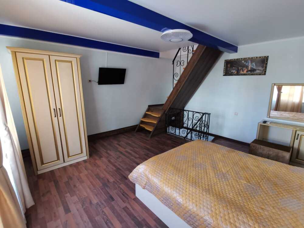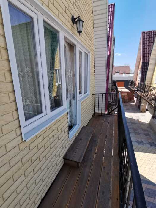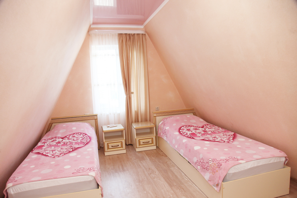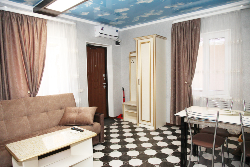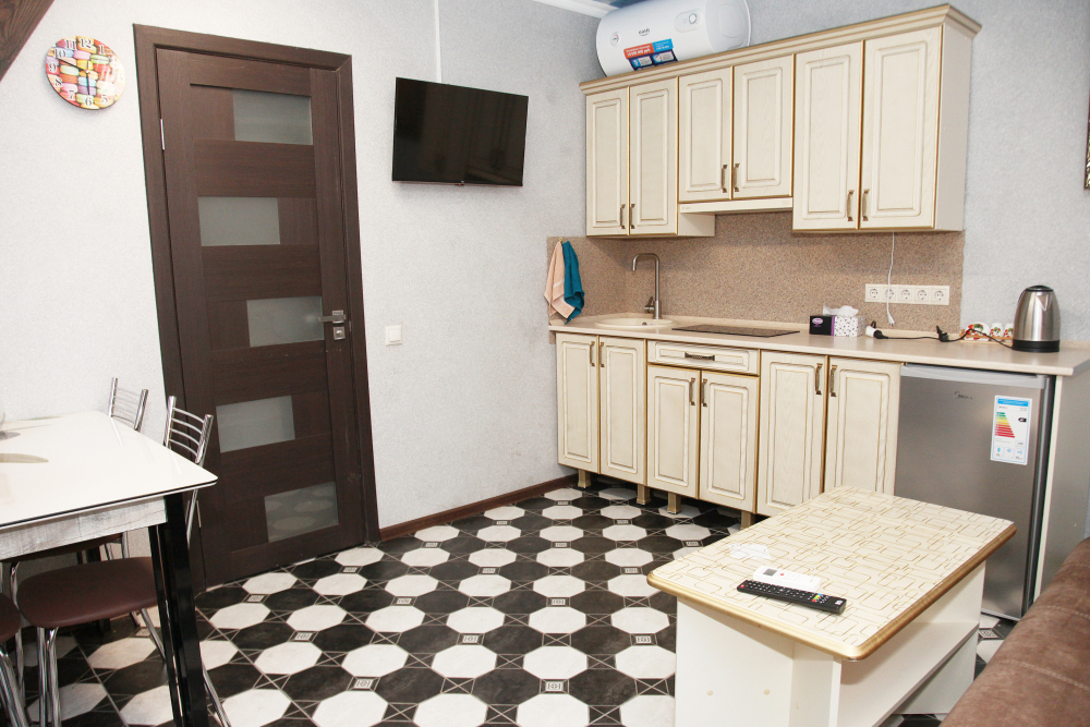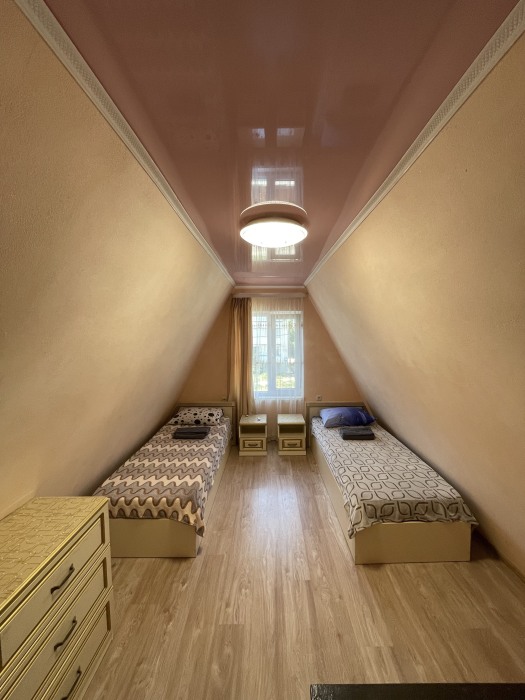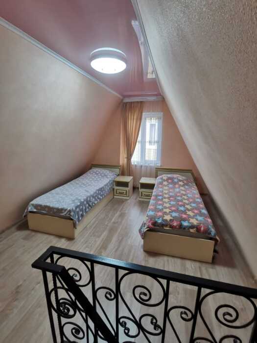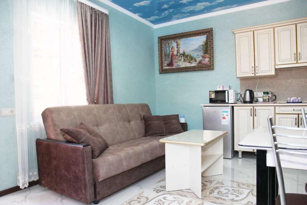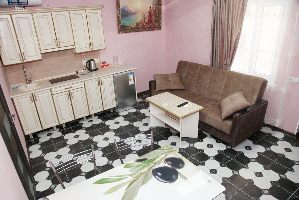 Аппарт-коттедж рассчитан на 6 гостей. Есть возможность размещения 2 доп. мест с доплатой. В каждом коттедже имеется полноценная кухня с посудой, холодильник, TV, спальня с балконом + детская.