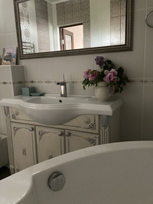 На втором этаже спальня, гардеробная, дополнительный санузел и ванна.