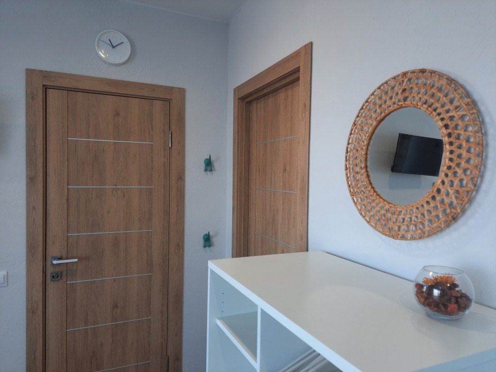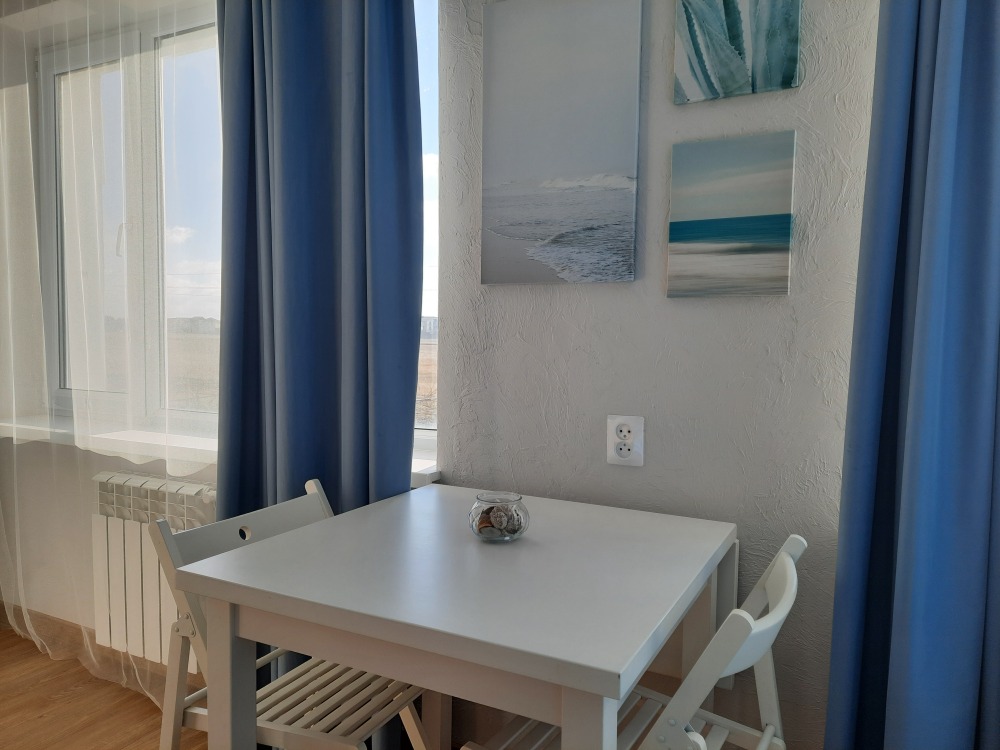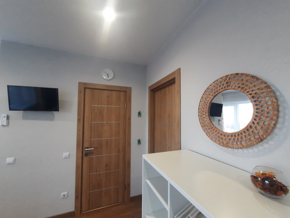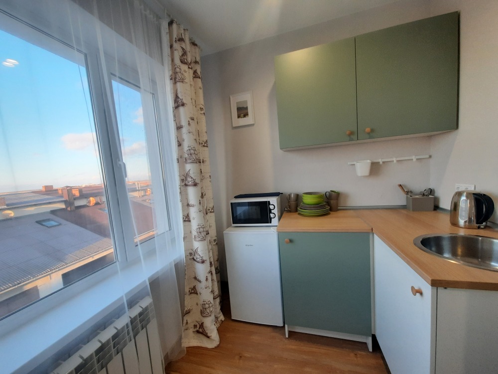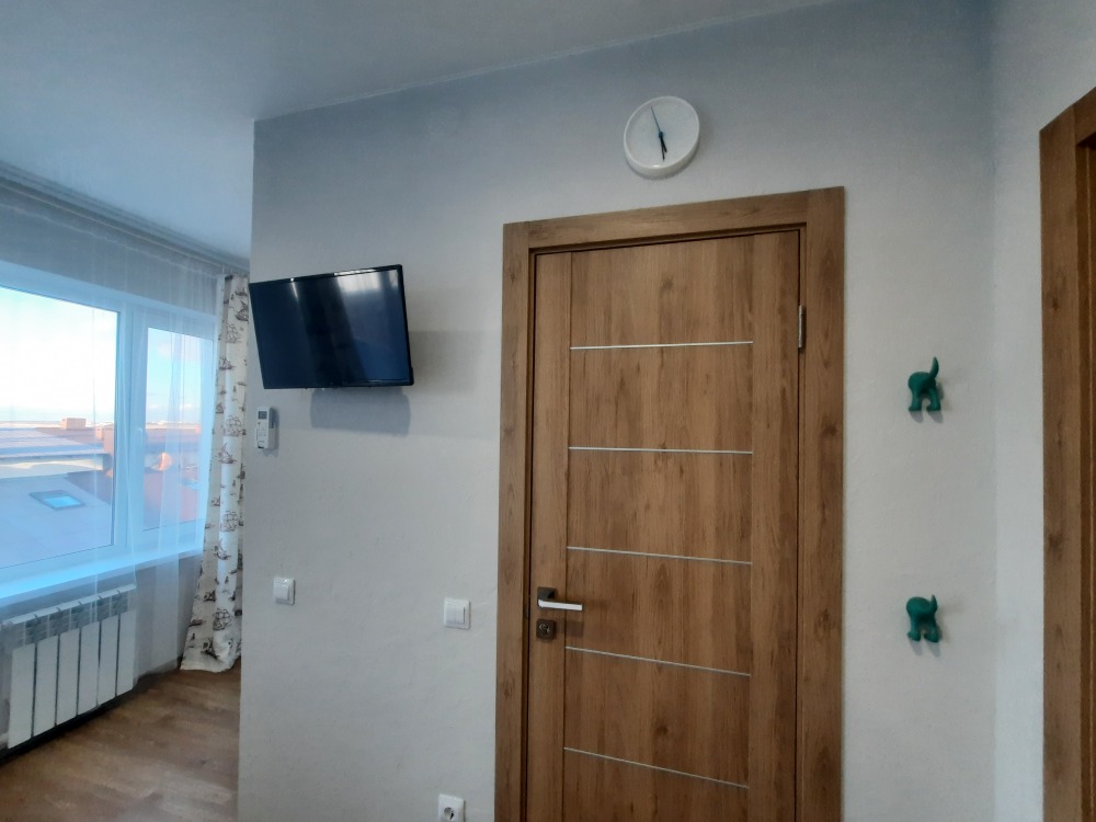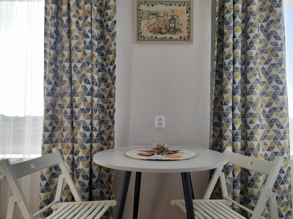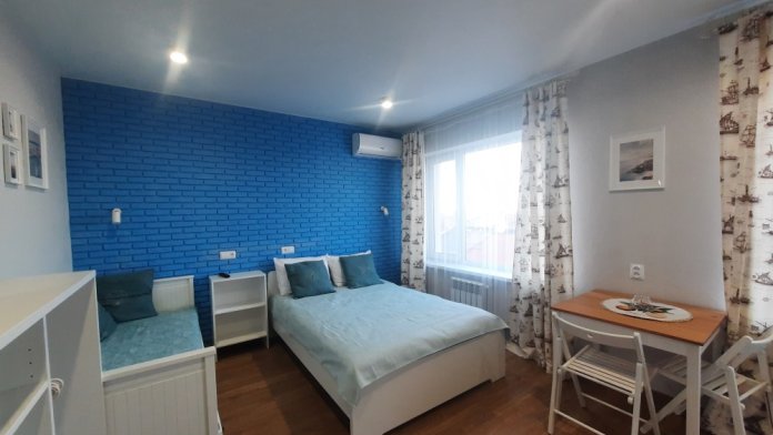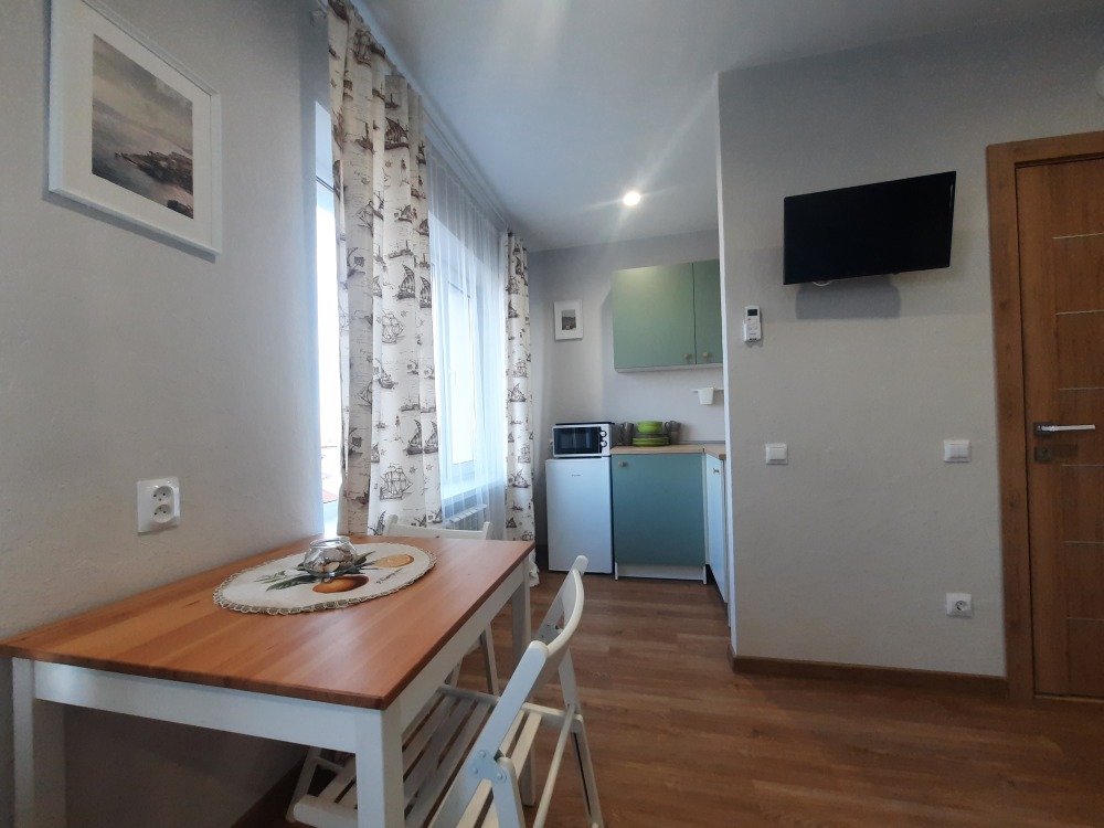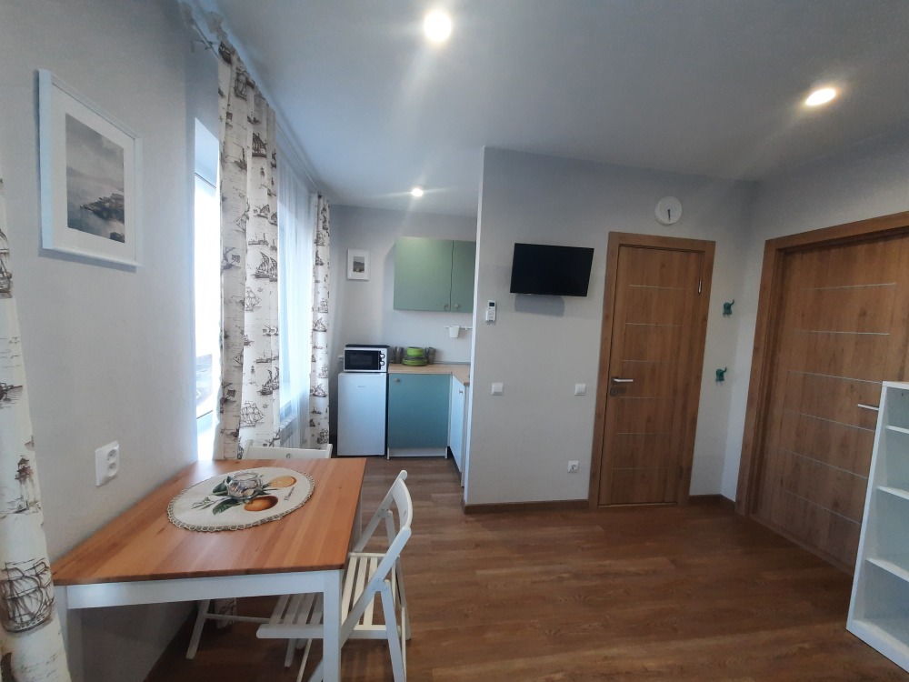 В апартаментах двуспальная кровать, раскладная диван -кушетка Икея «Хемнис» (раскладывается при необходимости в кровать 160*200), или двуярусная кровать (идеально для гостей с 2 детьми, только в номерах на 2 этажах), обеденная зона на 4 гостей, гардероб, комод, тумбочка и др. удобства в номере.
