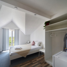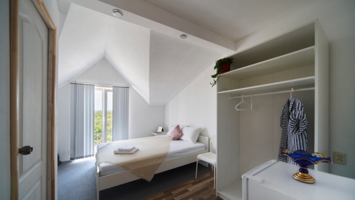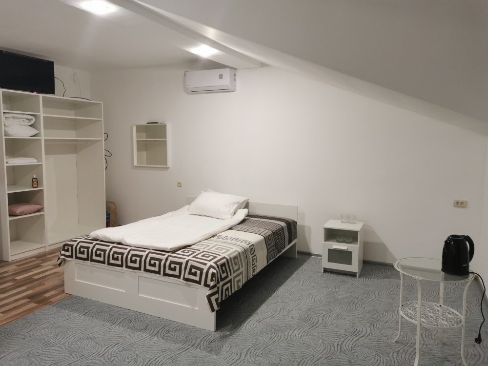 Номер оборудован мебелью и техникой для комфортного проживания: двуспальная или 2 односпальные кровати, прикроватные тумбочки, шкаф, зеркало, кондиционер, холодильник, телевизор, чайник. Фен, утюг и микроволновая печь имеются на этаже.