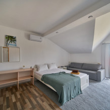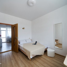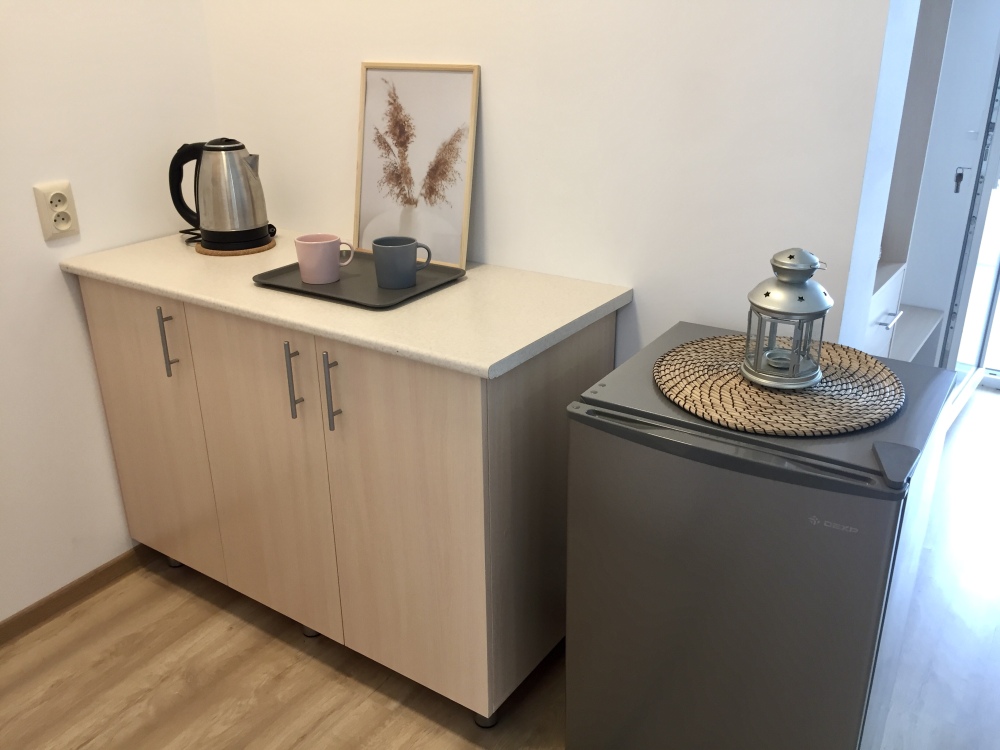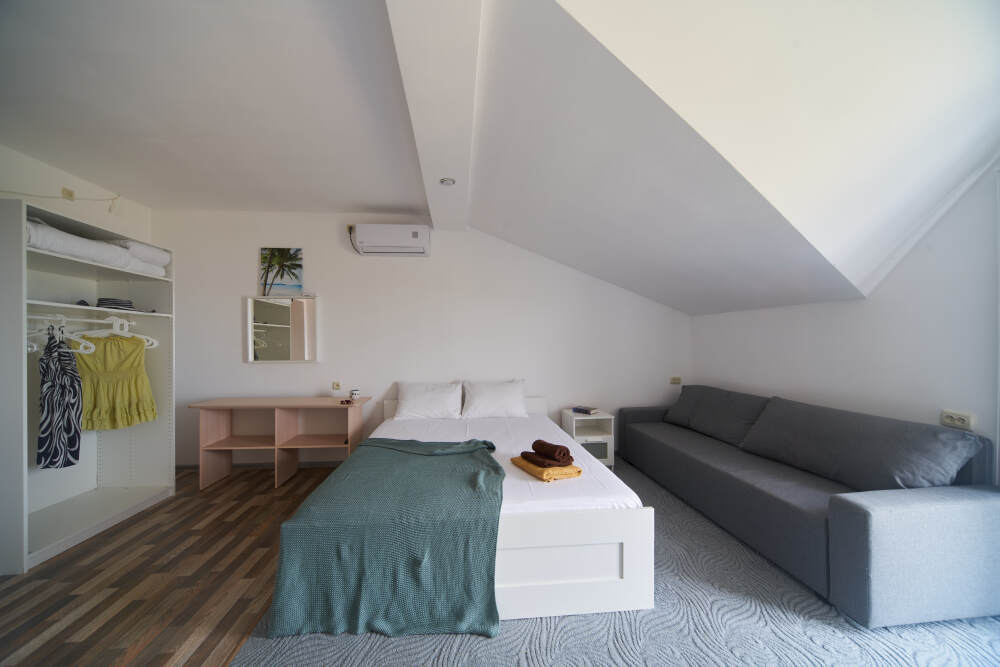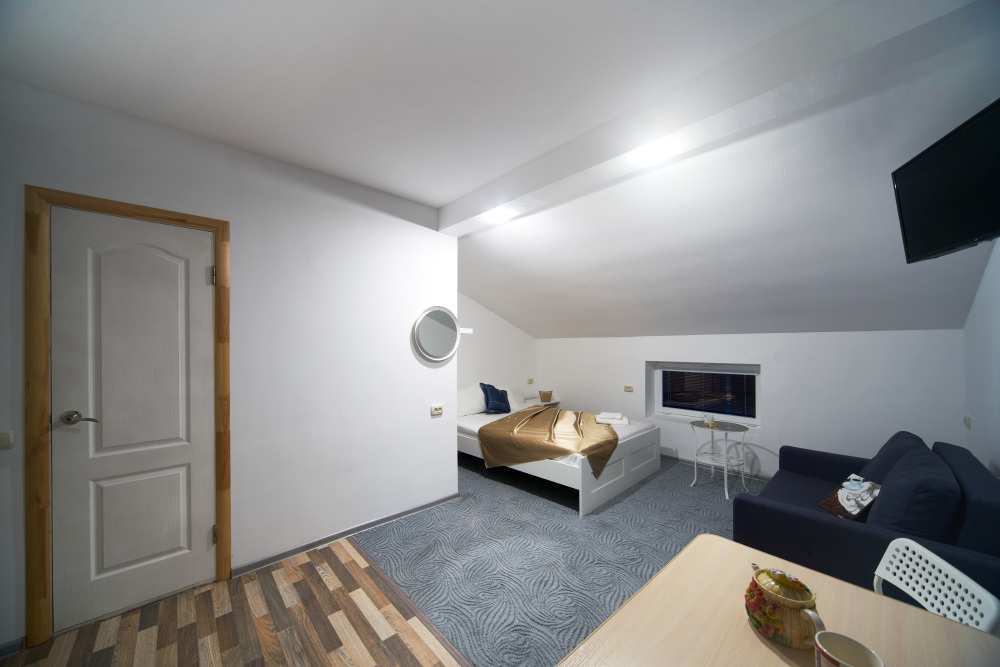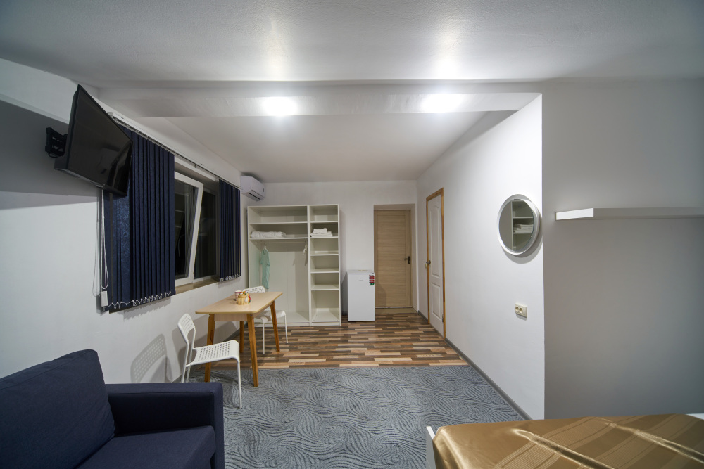 Номер оборудован мебелью и техникой для комфортного проживания: двуспальная кровать и двуспальный диван, прикроватные тумбочки, шкаф, зеркало, кондиционер, холодильник, телевизор, чайник. Фен, утюг и микроволновая печь имеются на этаже.