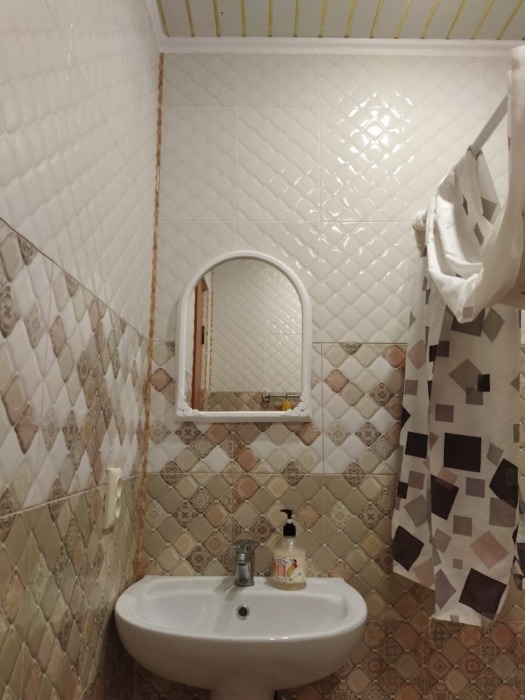Номер оборудован мебелью и техникой для комфортного проживания: двуспальная и односпальная кровати, прикроватные тумбочки, шкаф, зеркало, кондиционер, холодильник, телевизор, чайник. Фен, утюг и микроволновая печь имеются на этаже.